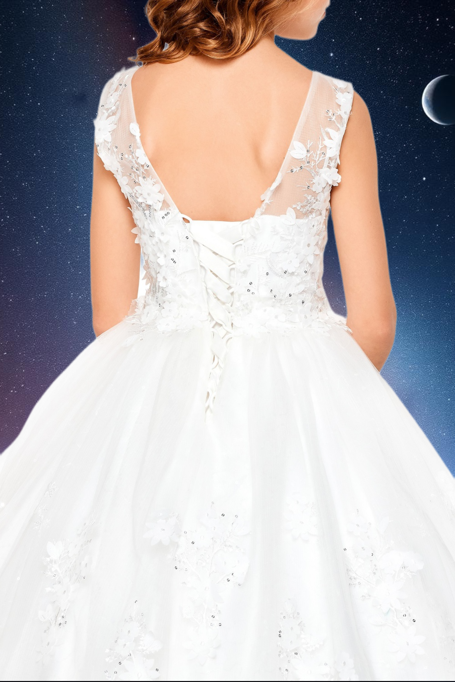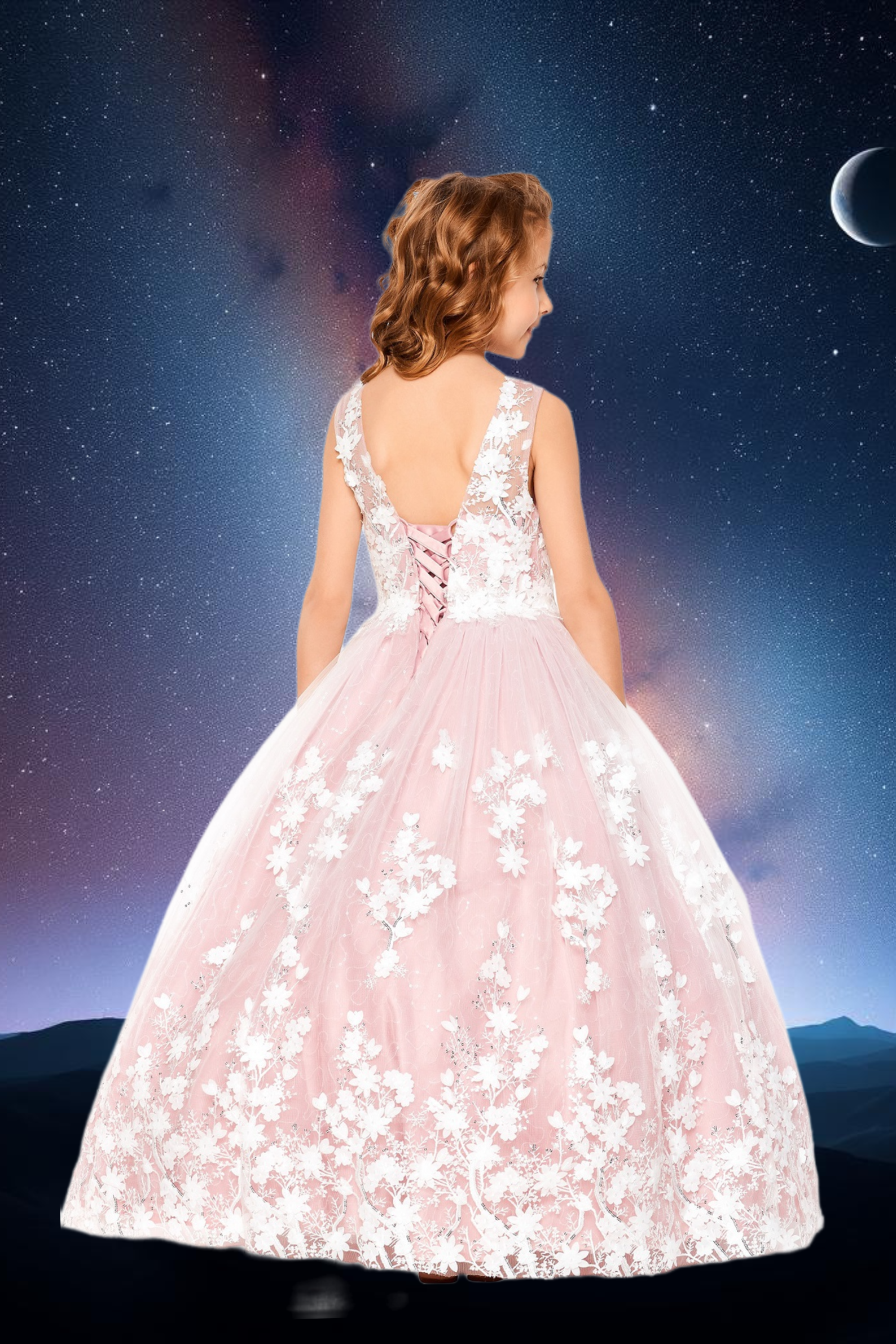 Grace and elegance come together in this breathtaking lilac ball gown, designed for girls who deserve to shine at their most special occasions. The gown features a sheer illusion neckline adorned with delicate white floral lace appliqué cascading over a full tulle skirt, creating a romantic and timeless look. The corset lace-up back ensures a perfect adjustable fit, while the voluminous skirt gives a regal silhouette ideal for pageants, communions, or formal celebrations. A statement piece that balances sophistication with youthful charm, this gown guarantees your little one will feel like a true princess.