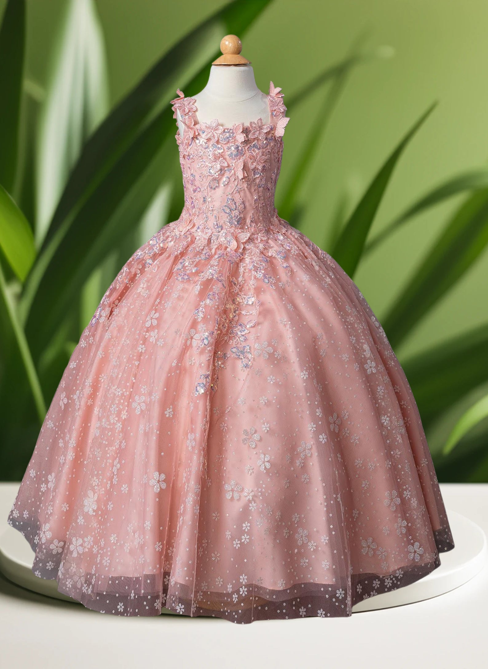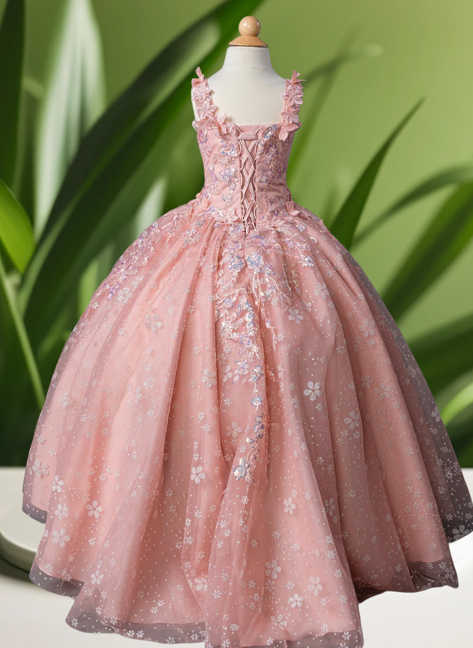 The Liliana Blossom Gown is a garden of elegance brought to life in soft blush pink. Covered in dainty white floral motifs and delicate 3D flower appliqués, this enchanting gown features a full ball gown skirt and a structured bodice with a romantic lace-up back. Ruffled floral shoulder straps add a sweet fairy-tale touch. Perfect for flower girl moments, pageants, birthdays, or any special celebration, this gown combines graceful charm and sparkle with comfort and fit that’s ideal for twirling the day away.