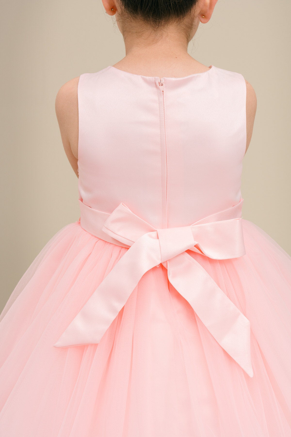 The Lily Belle Dress is a charming short floral appliqued tulle dress designed for girls who love soft color and graceful movement. This lovely style features a delicate embroidered bodice with floral appliqué details and a full layered tulle skirt that falls at a short, knee-length silhouette. A satin waistband and back bow add the perfect finishing touch for a polished look. Ideal for birthdays, flower girl moments, family photos, and special celebrations, this dress offers comfort, elegance, and timeless appeal. Available in blush, champagne, and off white, the Lily Belle Dress is a beautiful choice for any memorable occasion.