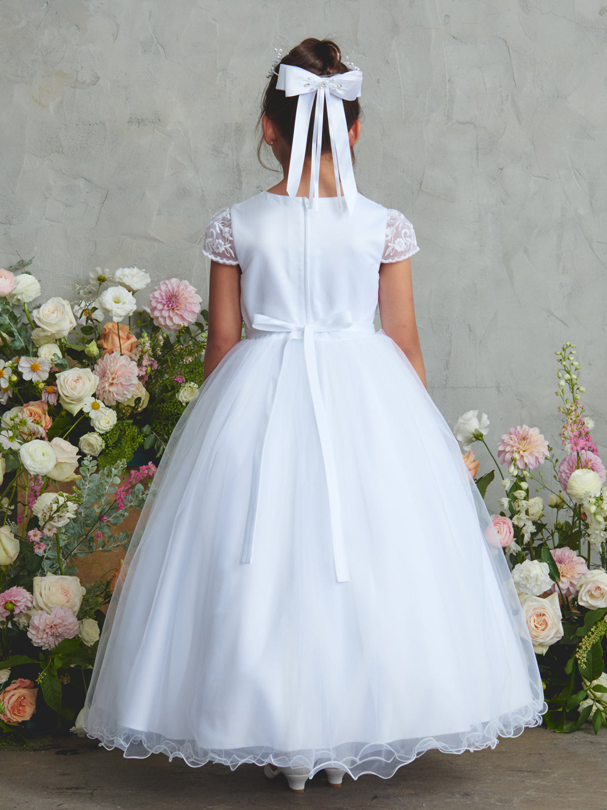 The Lily Petal Communion Dress is a charming and graceful choice for your little girl’s special day. This floor-length, fully lined white gown features a beautifully embroidered lace bodice with delicate floral detailing that feels fresh, light, and age-appropriate. Soft illusion cap sleeves add a gentle touch of elegance, while the airy tulle skirt flows naturally for comfort and movement. The subtle rolled hem gives the skirt a soft finish, and a satin waistband ties into a sweet bow at the back for a polished yet simple look. Perfect for First Communion, flower girl moments, portraits, and other special occasions, this dress offers timeless beauty at a low-to-medium price point — making it both meaningful and practical for families. Comfortable, classic, and easy to wear, the Lily Petal Communion Dress is a lovely option for celebrating such an important milestone.