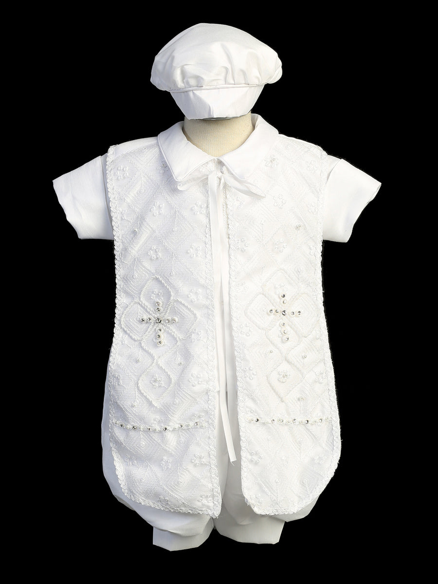 The Luca Dedication Set is a beautiful expression of tradition and faith, designed to honor your little one's most sacred milestone. This 3-piece boys' christening outfit includes a short-sleeve romper, a structured cap, and a stunning embroidered vest with detailed cross patterns and delicate beading. The textured diamond design, pearl accents, and satin ribbon closure add timeless charm to this heirloom-worthy ensemble. Available in your choice of White or Ivory, the Luca Set is perfect for baptisms, christenings, church blessings, or portraits. Tailored in soft, breathable fabric and offered in infant sizes for a picture-perfect fit.