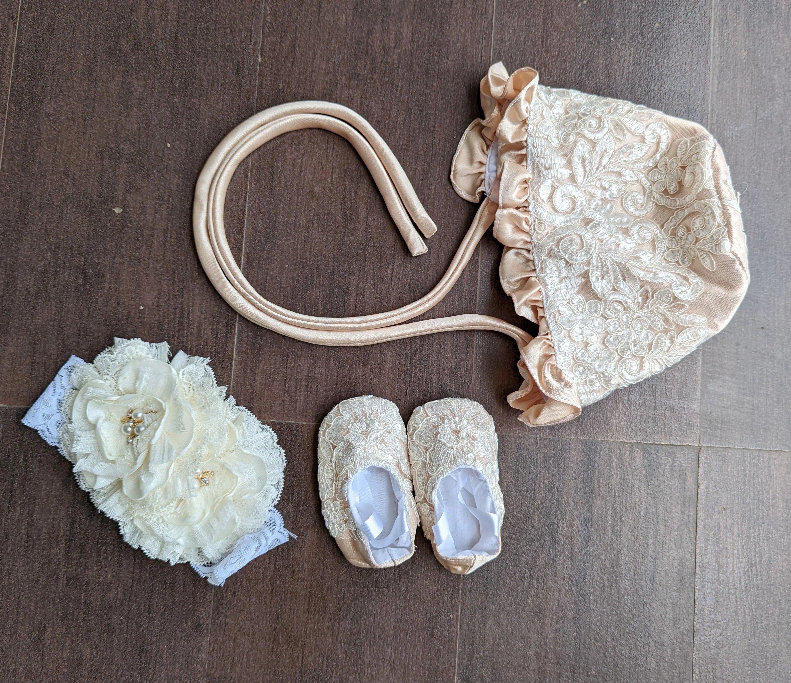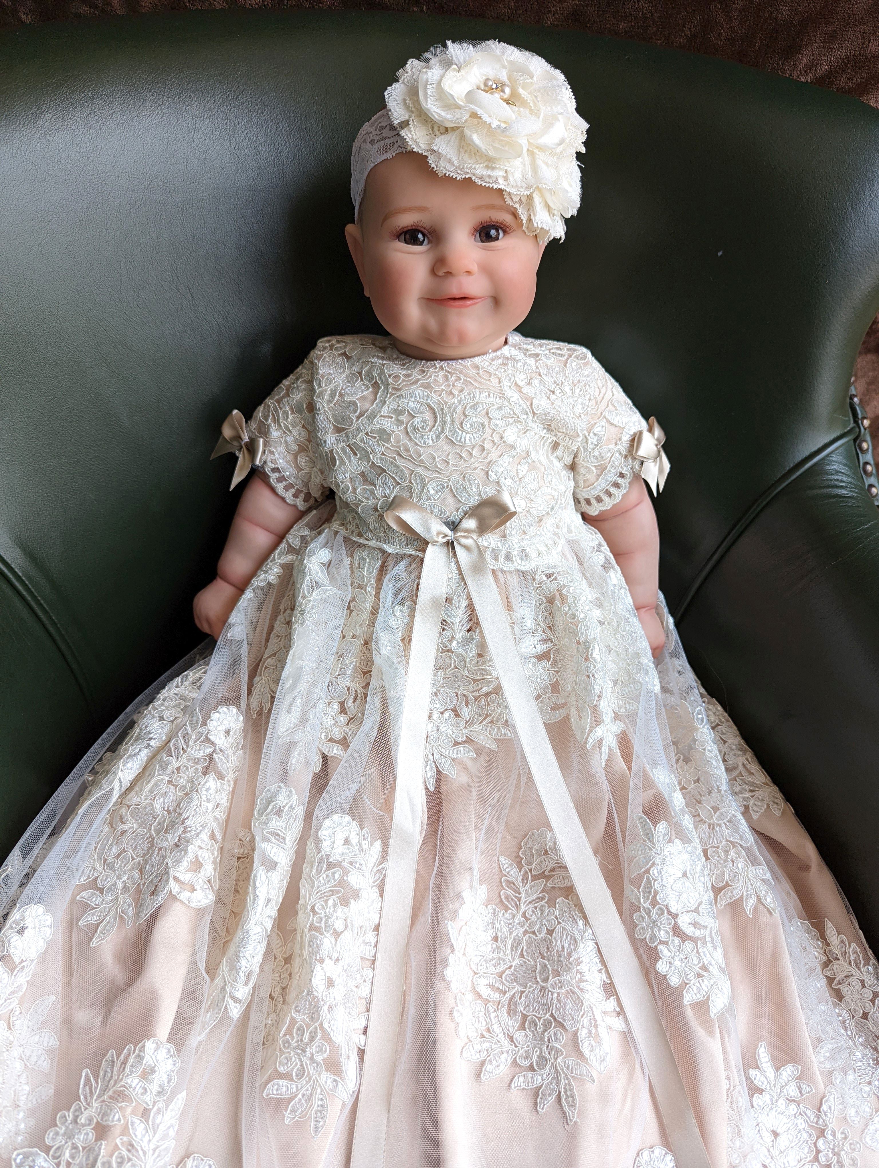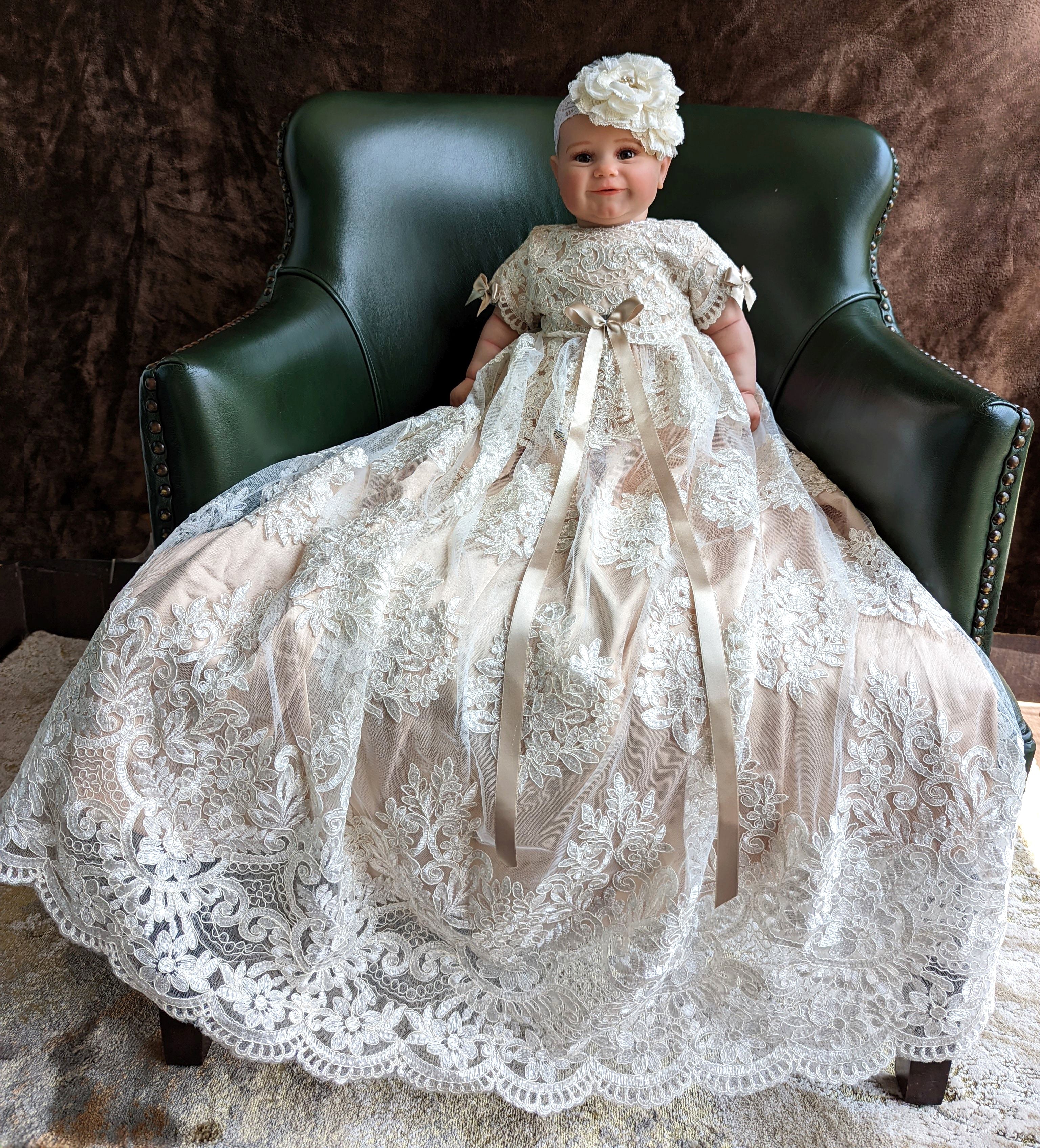 Stress Free Shipping Guarantee! In stock usually ships approximately 5-7 business days from our vendor’s warehouse. **Comes with matching bonnet & shoes** Length is approximately 35” | Dry Clean Only!