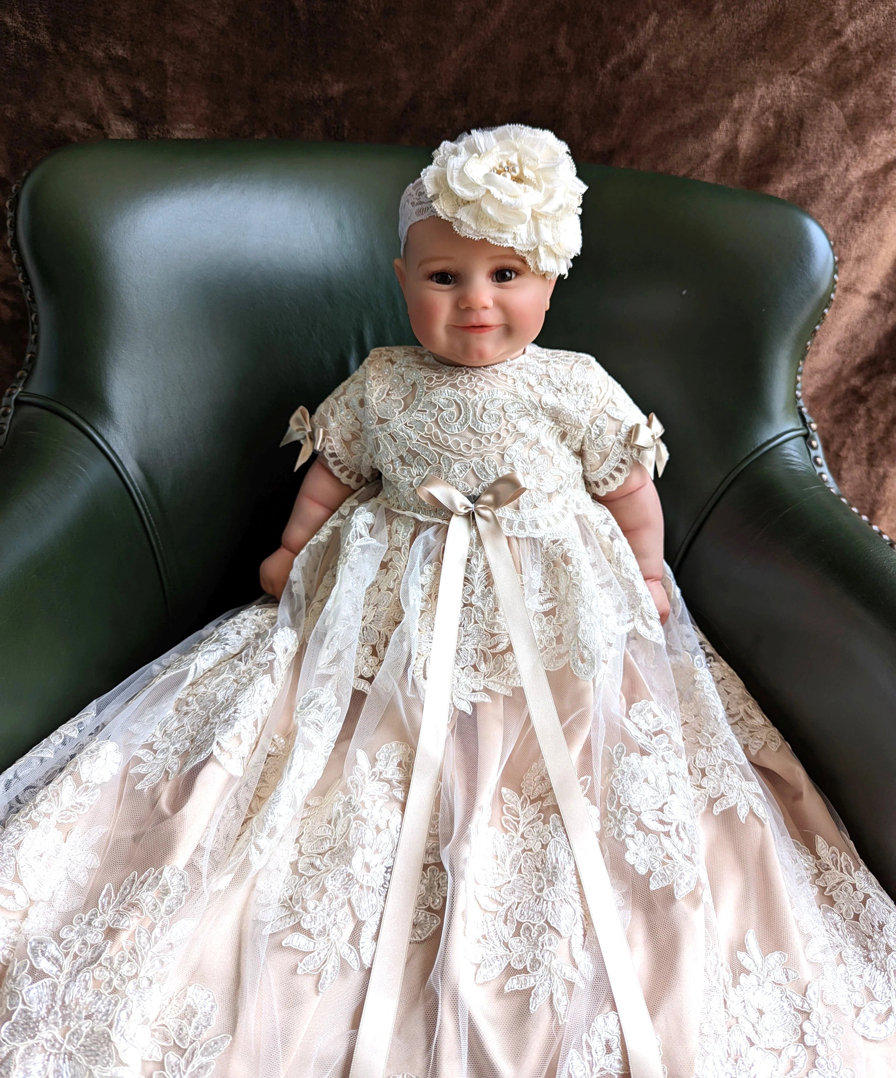 The Eliana gown comes exquisitely complemented by a matching bonnet and shoes, ensuring your little one’s christening ensemble is enchanting and cohesive. The back of the gown features delicate pearl button loop closures, adding a touch of classical beauty and ease of dressing. But what truly sets the Eliana apart is its breath-taking embroidery – sequined lace that captures and reflects light, adding a subtle sparkle and unparalleled sophistication to your baby’s debut. Each gown is 100% handmade, embodying the essence of craftsmanship and the spirit of a family treasure that will be cherished and passed down through generations.