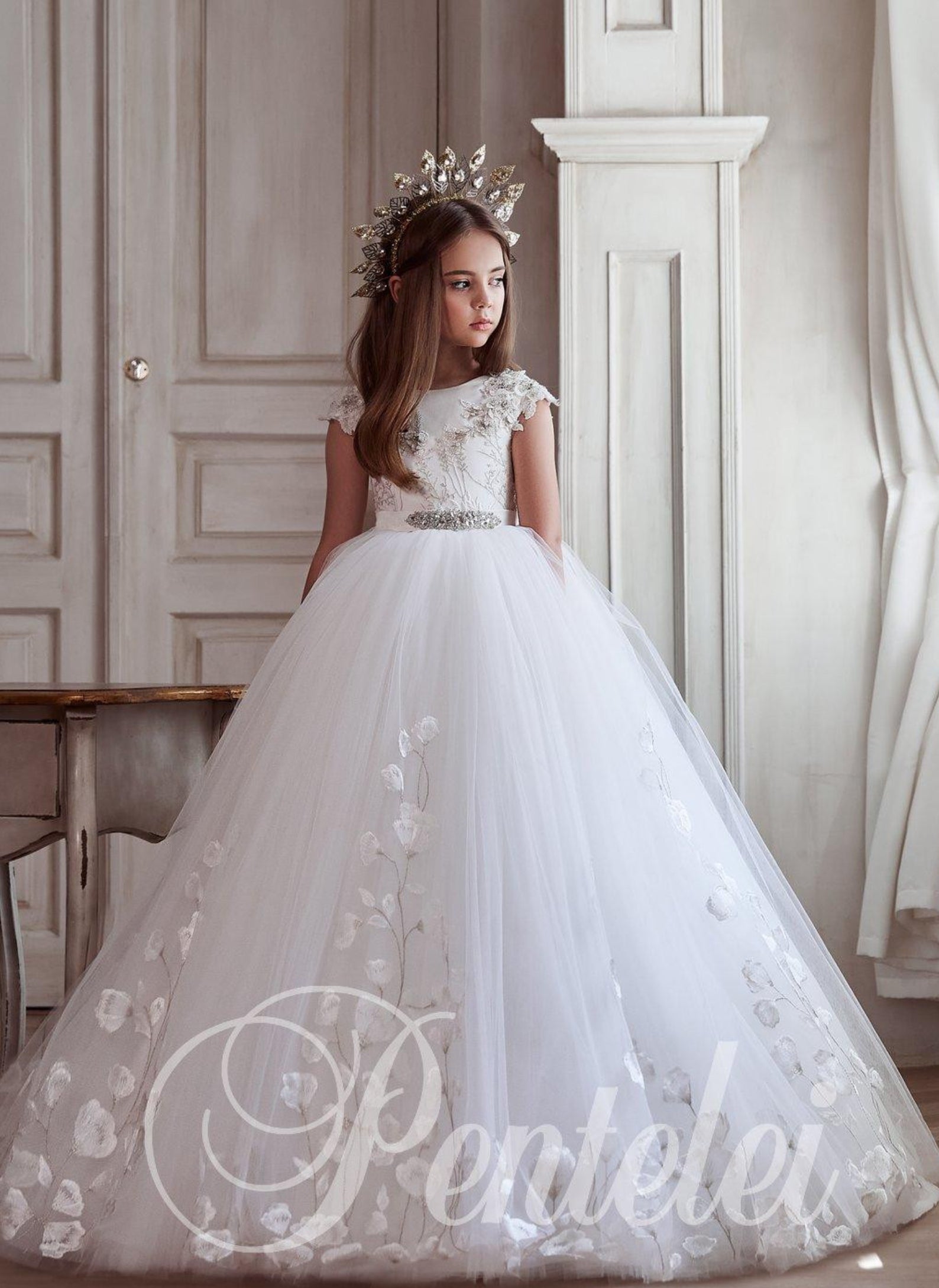A breathtaking gown from the Pentelei Couture collection, the Lydia dress enchants with delicate floral appliqués cascading along the hemline and a voluminous white tulle skirt that glows with ethereal charm. The fitted bodice features soft cap sleeves and intricate lacework with subtle sequin accents, while a crystal-embellished belt and dramatic bow at the back add exquisite finishing touches. Ideal for first communion, flower girl, or pageant events, this gown is a statement in timeless elegance and regal poise.
