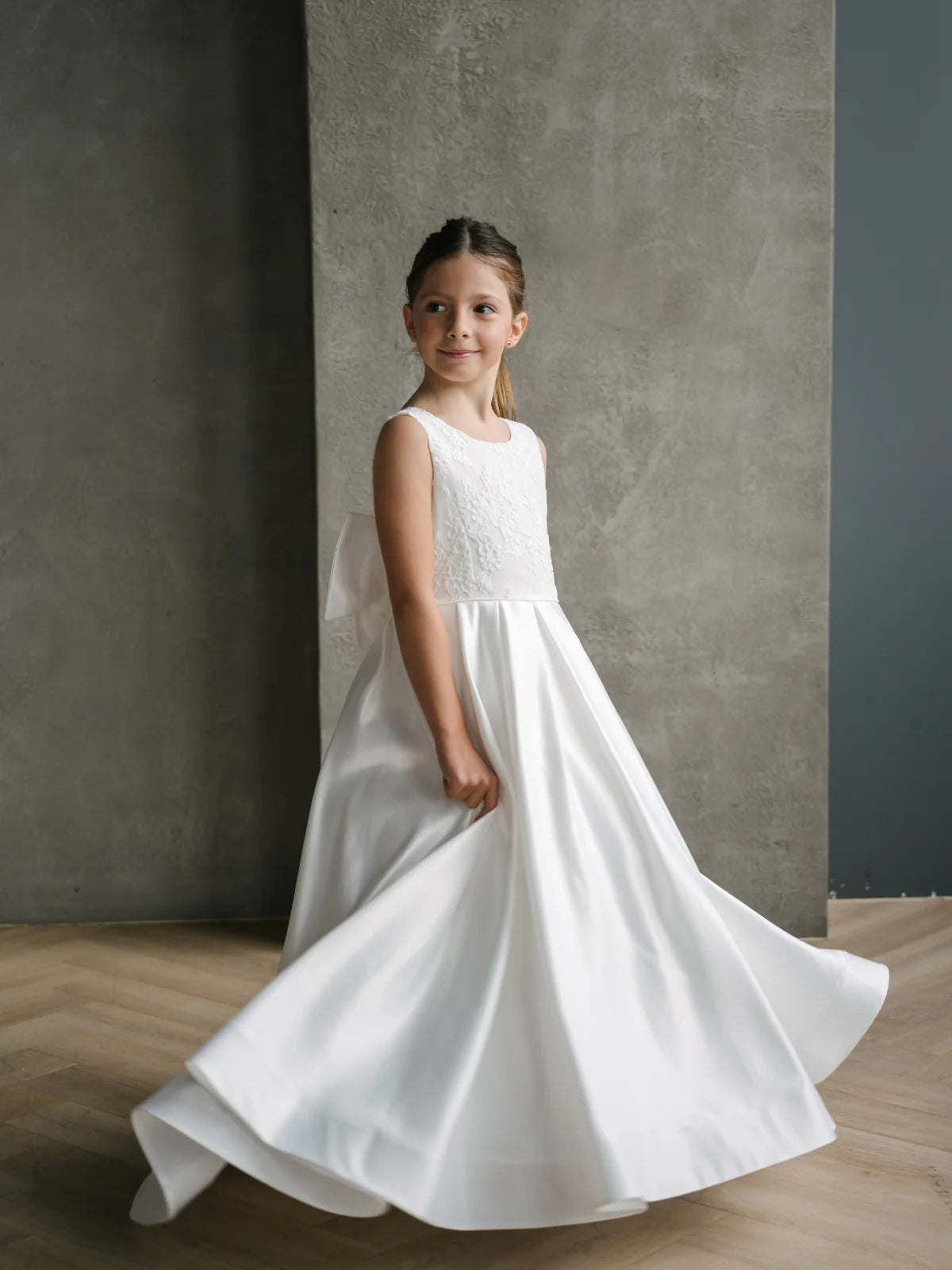 The Maeva Grace Gown by Teter Warm Couture is a timeless expression of elegance, designed for first communion, flower girl moments, and cherished special occasions. This exquisite off-white satin gown features a delicately textured lace bodice that flows into a full, softly structured skirt, creating a graceful silhouette that moves beautifully with every step. The back of the gown is adorned with a dramatic satin bow and a refined V-back detail, finished with cascading pearl accents that add a subtle couture touch. Thoughtfully crafted for comfort as well as beauty, this gown is ideal for long ceremony days while maintaining a polished, classic look. Perfect for parents seeking a traditional yet elevated communion dress that photographs beautifully and becomes a treasured keepsake.
