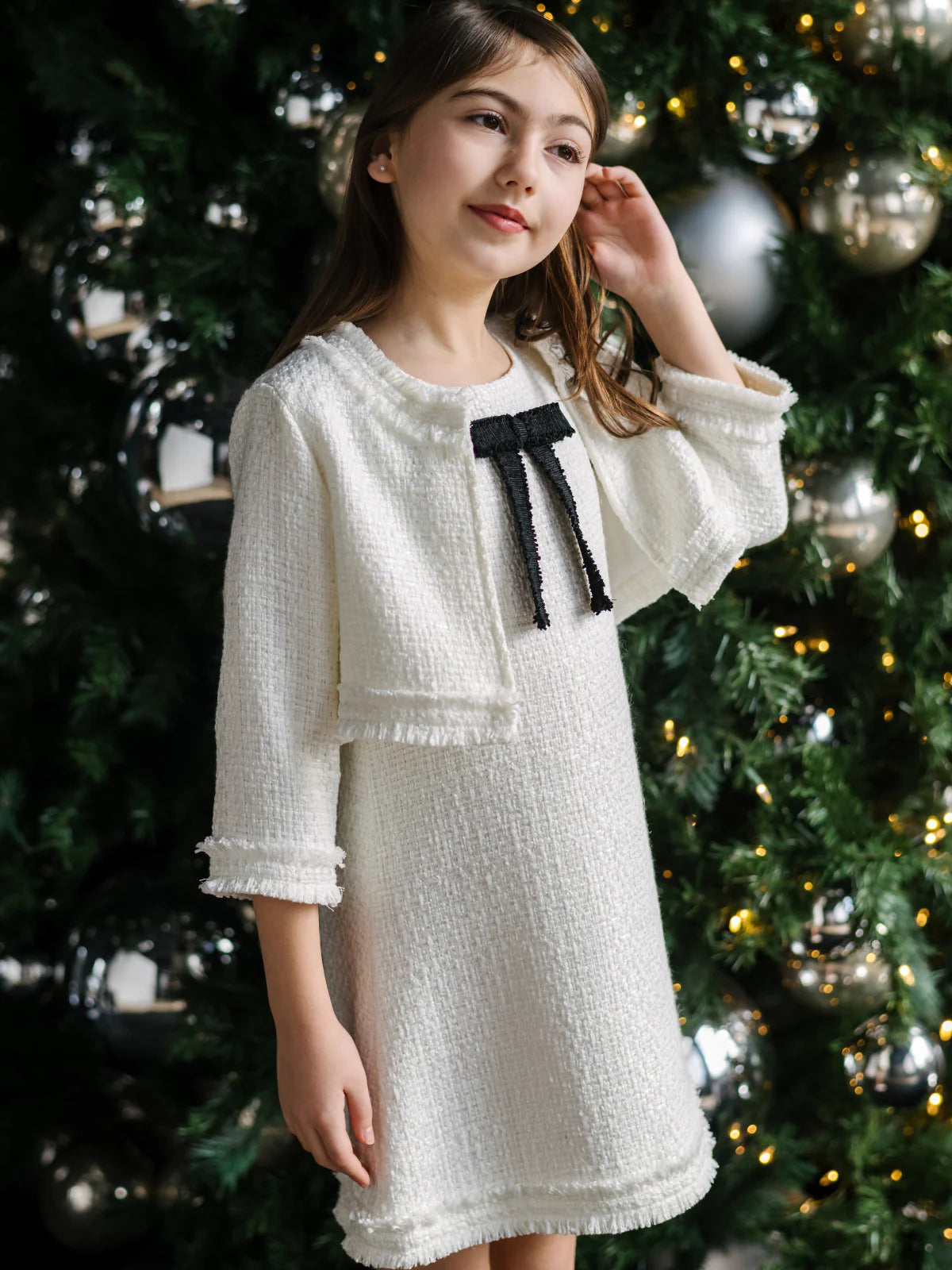 The Margaux dress by Teter Warm is a timeless ivory tweed party dress inspired by classic Parisian elegance. Designed with a clean sleeveless silhouette and accented by a refined black bow at the neckline, this dress delivers a polished, boutique look that feels both modern and effortlessly chic. Ideal for pageant interviews, holiday celebrations, birthdays, portraits, weddings, and special occasions, Margaux offers versatile styling that transitions beautifully across seasons. The softly textured ivory tweed photographs exquisitely, making it a favorite for professional photos and elegant events. A matching jacket is available and sold separately, allowing for a complete, coordinated look when desired.