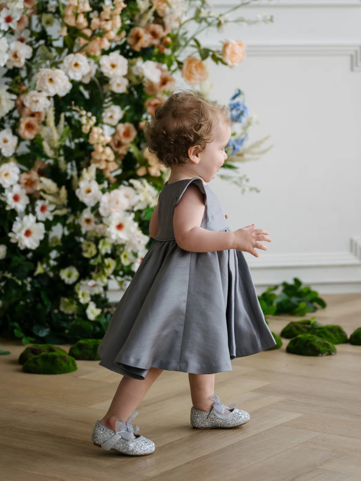The Maribel Greyson Baby Dress by Teter Warm Couture is a refined couture design created for timeless childhood moments. Crafted in a rich dark grey hue, this elegant baby dress features a softly structured bodice, delicate cap sleeves, and a full gathered skirt that drapes beautifully with every step. The understated silhouette highlights the luxurious simplicity of the design, making it effortlessly sophisticated. Perfect for christenings, first birthdays, portraits, formal celebrations, and special occasions, this couture baby dress blends comfort with elevated craftsmanship. The neutral grey tone offers a modern alternative to traditional pastels while remaining classic and versatile. Exclusively curated for Blush Kids, the Maribel Greyson dress reflects the signature elegance and quality of the Teter Warm Couture collection.