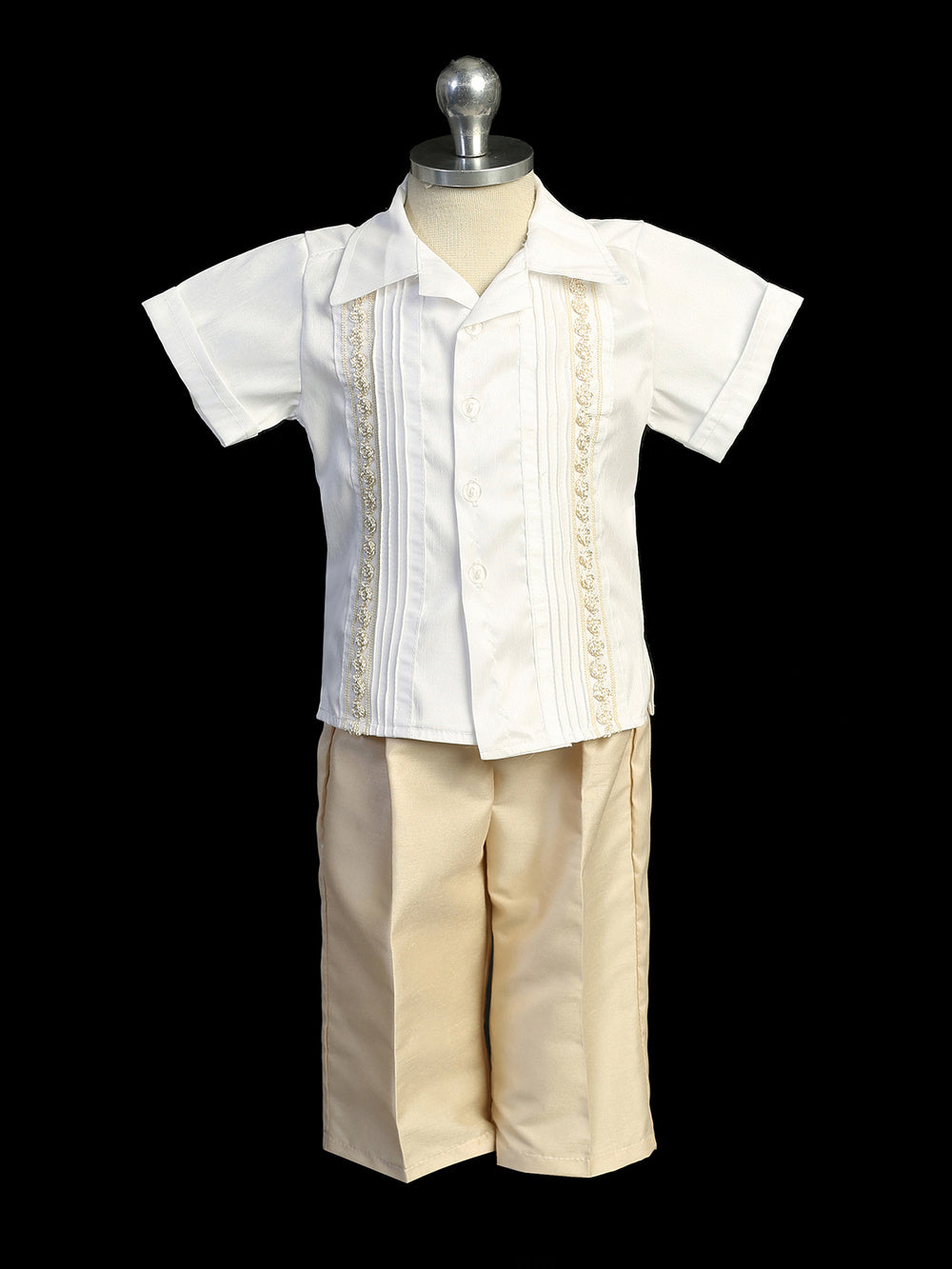 The Mateo Guayabera Set offers classic cultural charm with a crisp, tailored touch. Inspired by the traditional Latin American Guayabera, this two-piece outfit features a short-sleeve shirt with vertical embroidery and pin-tuck pleats, paired with matching lightweight trousers. Perfect for christenings, family events, destination weddings, or after-ceremony celebrations, the Mateo set blends timeless heritage with breathable comfort. Available in white or ivory/khaki combination, this look brings effortless elegance to any formal or festive occasion.