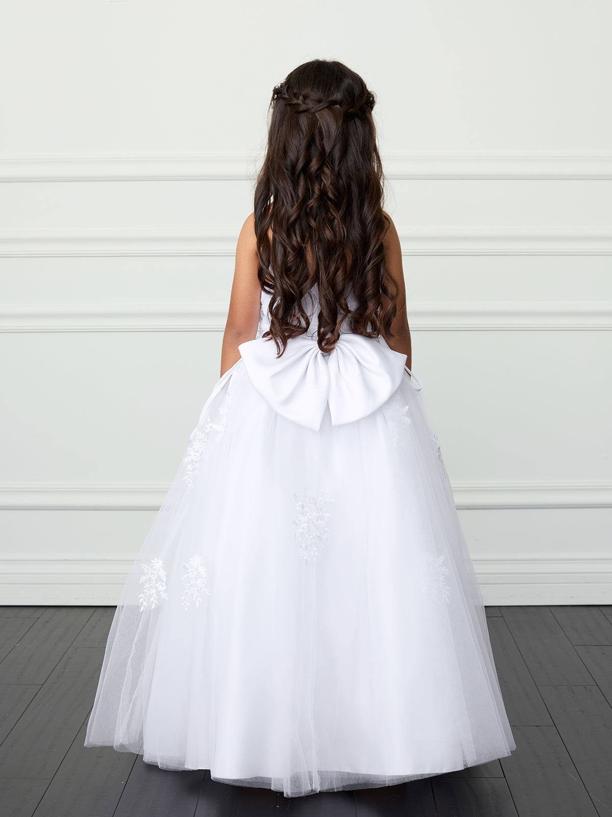 The Melody Girls Dress is a charming and elegant gown designed for special occasions. Featuring a Maria embroidered tulle skirt and a rhinestone-accented waist, this dress offers a stunning combination of sparkle and sophistication. The side corset ties and rear center zipper provide a secure and custom fit, while the large satin bow accent adds a touch of timeless beauty. Paired with a satin bolero jacket for added versatility, the Melody dress is perfect for communions, flower girl roles, or other memorable events.
