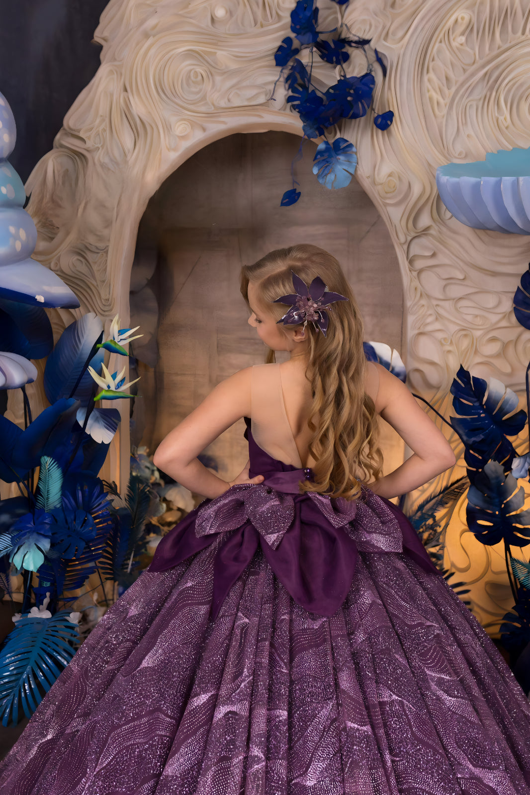 Make a grand entrance in the Moonlight Majesty Gown, a striking purple couture masterpiece made for pageants and father-daughter dances. Crafted with shimmering layered tulle and a sculptural one-shoulder bodice, this luxurious gown radiates drama and elegance. The full, sweeping skirt dazzles with intricate glitter accents, while the dimensional petal-like bow at the waistline adds an artistic flourish. Designed for girls who love the spotlight, this custom gown is the definition of statement-making beauty.
