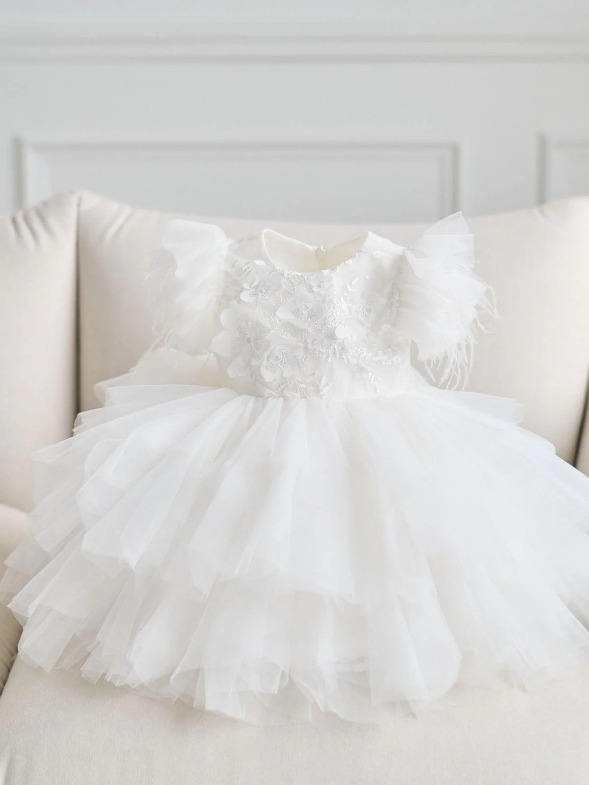 Effortlessly elegant, the Off White Couture Lace Christening Short Dress is a show stopping look your little one will adore. This heirloom-quality dress is a timeless piece she'll cherish for years to come. The luxurious lace and whimsical floral details create a look that's both refined and playful - perfect for her special day. With its classic round neckline and flattering silhouette, this dress will have her feeling like a true princess.