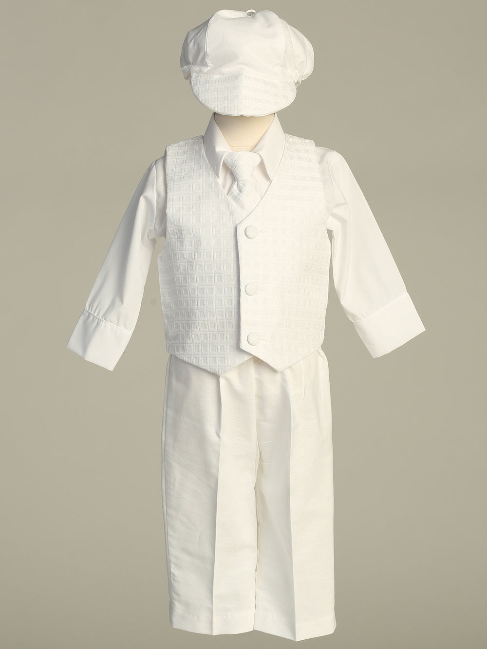 Celebrate your baby boy’s special day with the Stephan White Christening Outfit. This timeless ensemble features a tailored vest with subtle textured details, crisp white pants, and a classic long-sleeve shirt. The outfit is complemented by a matching tie and an adorable newsboy cap, adding a touch of vintage charm. Designed with comfort in mind, this outfit ensures your little one looks angelic and feels at ease during his christening or baptism. A perfect choice for creating unforgettable memories.