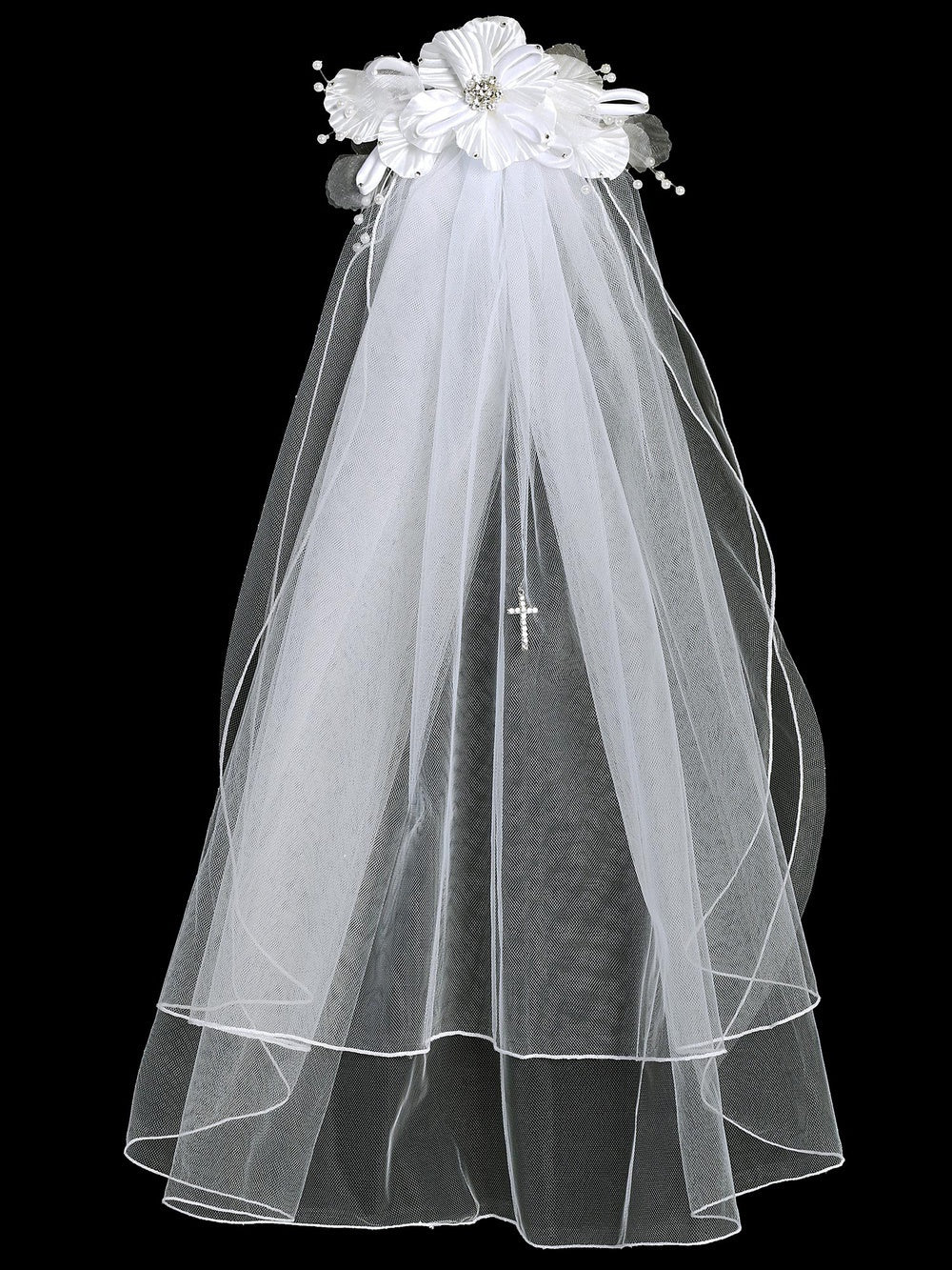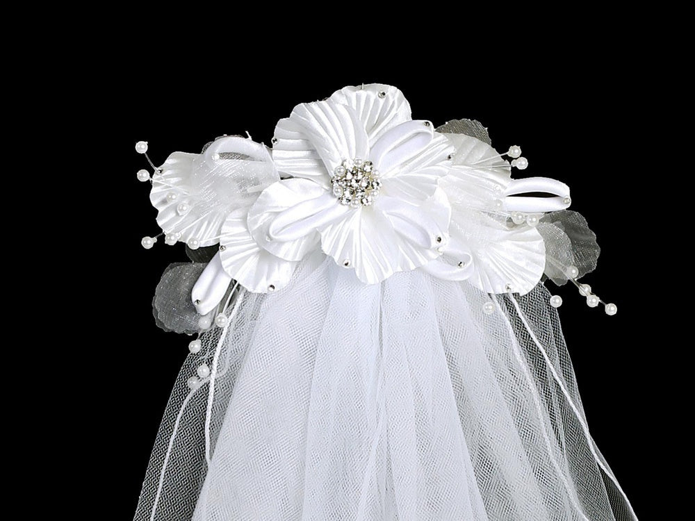 Elevate your child’s special day with the Ophelia Kids Communion Veil. Featuring delicate organza flowers, shimmering rhinestones, and elegant pearls, this 24" veil on comb adds the perfect finishing touch for a First Communion or special occasion. Crafted for comfort and beauty, it complements a variety of First Communion dresses while ensuring a graceful, timeless look.
