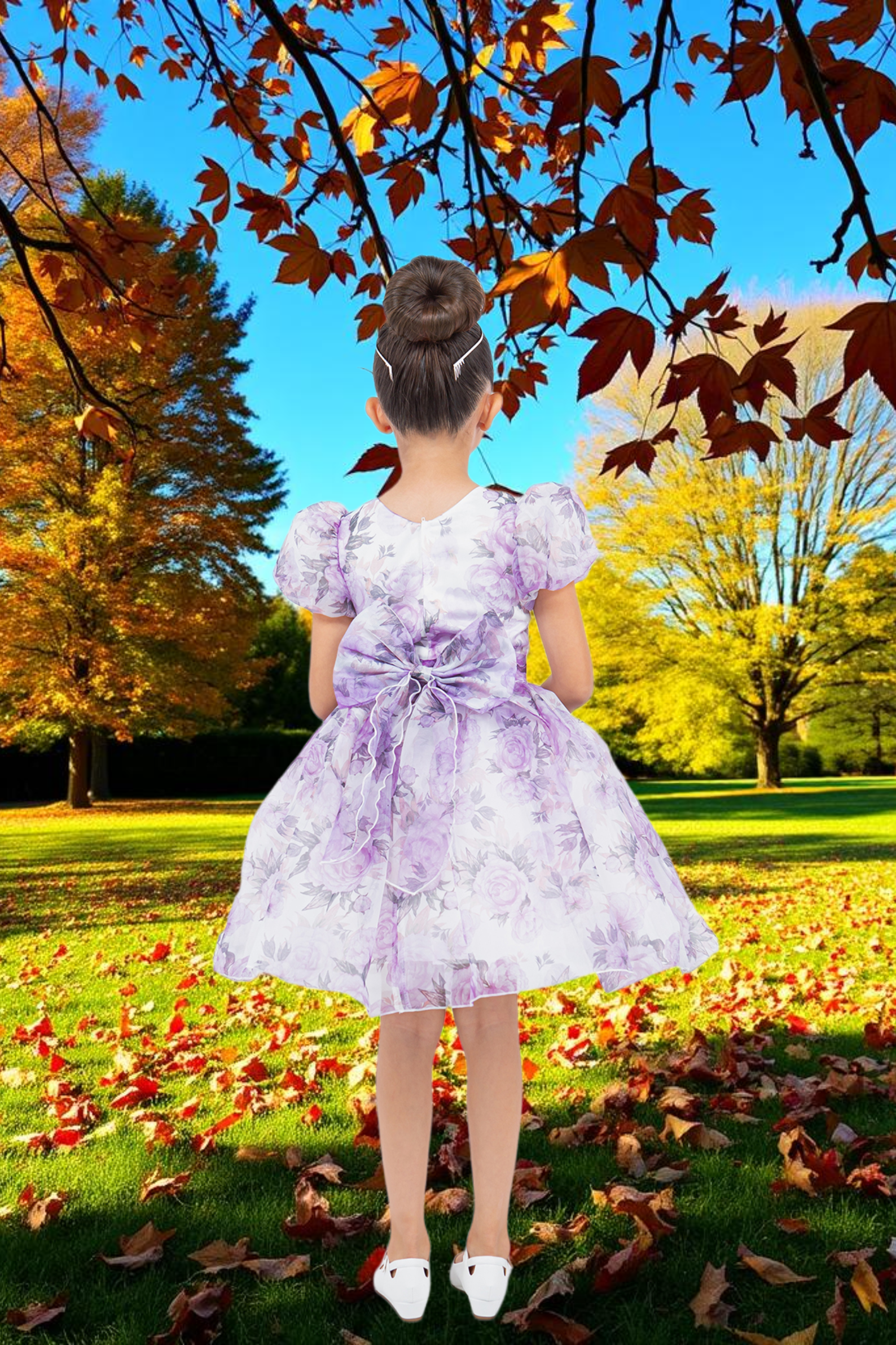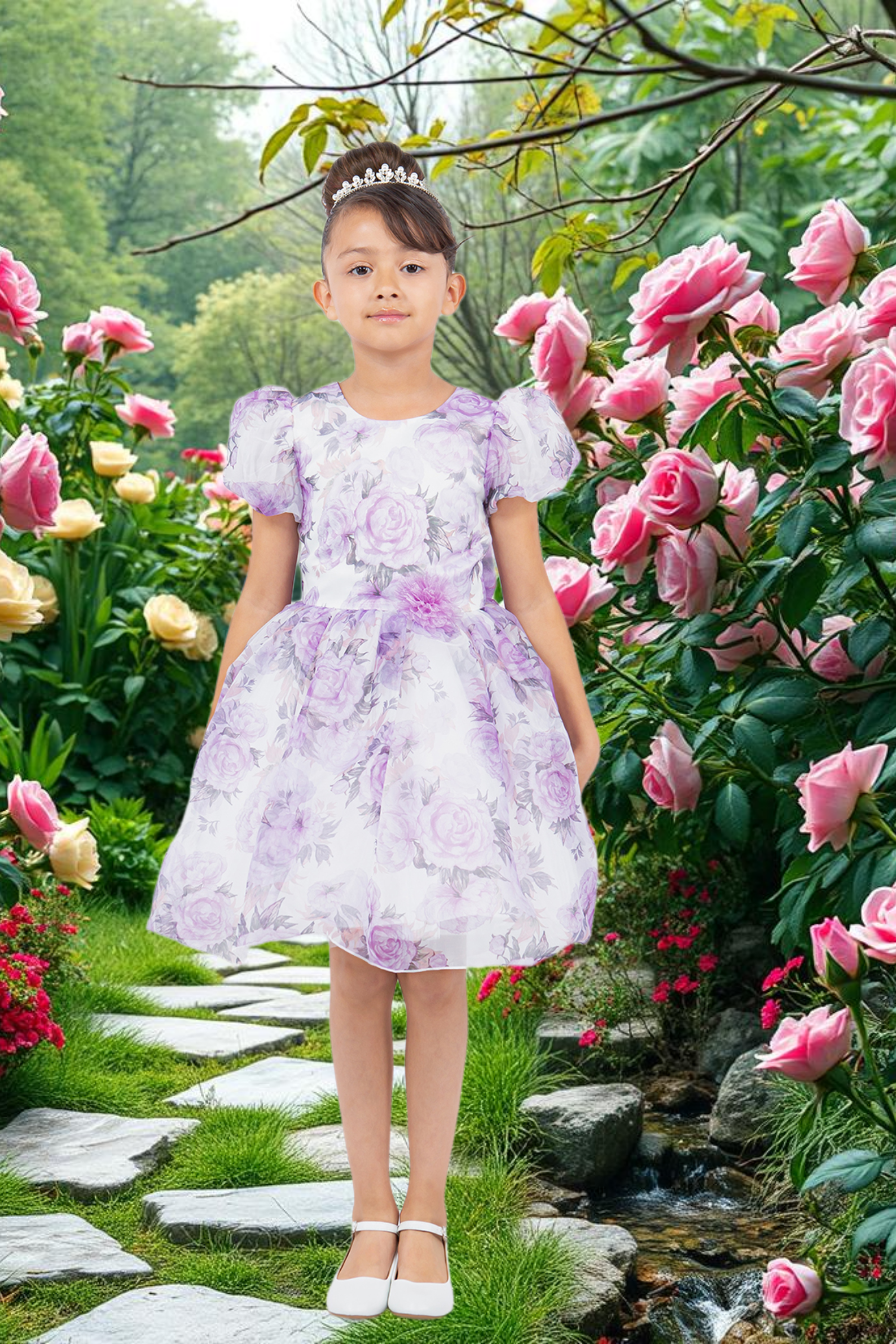 This charming girls’ party dress brings elegance and playfulness together in one beautiful design. Featuring puff sleeves, a fitted bodice, and a voluminous skirt adorned with soft floral patterns, it’s perfect for birthdays, family gatherings, weddings, or any special occasion. The dress is available in two lovely shades — peach or lilac — each with a matching back bow and delicate floral waist accent for added charm. Its lightweight fabric ensures comfort, while the classic silhouette makes it a timeless favorite for young girls who love to twirl.