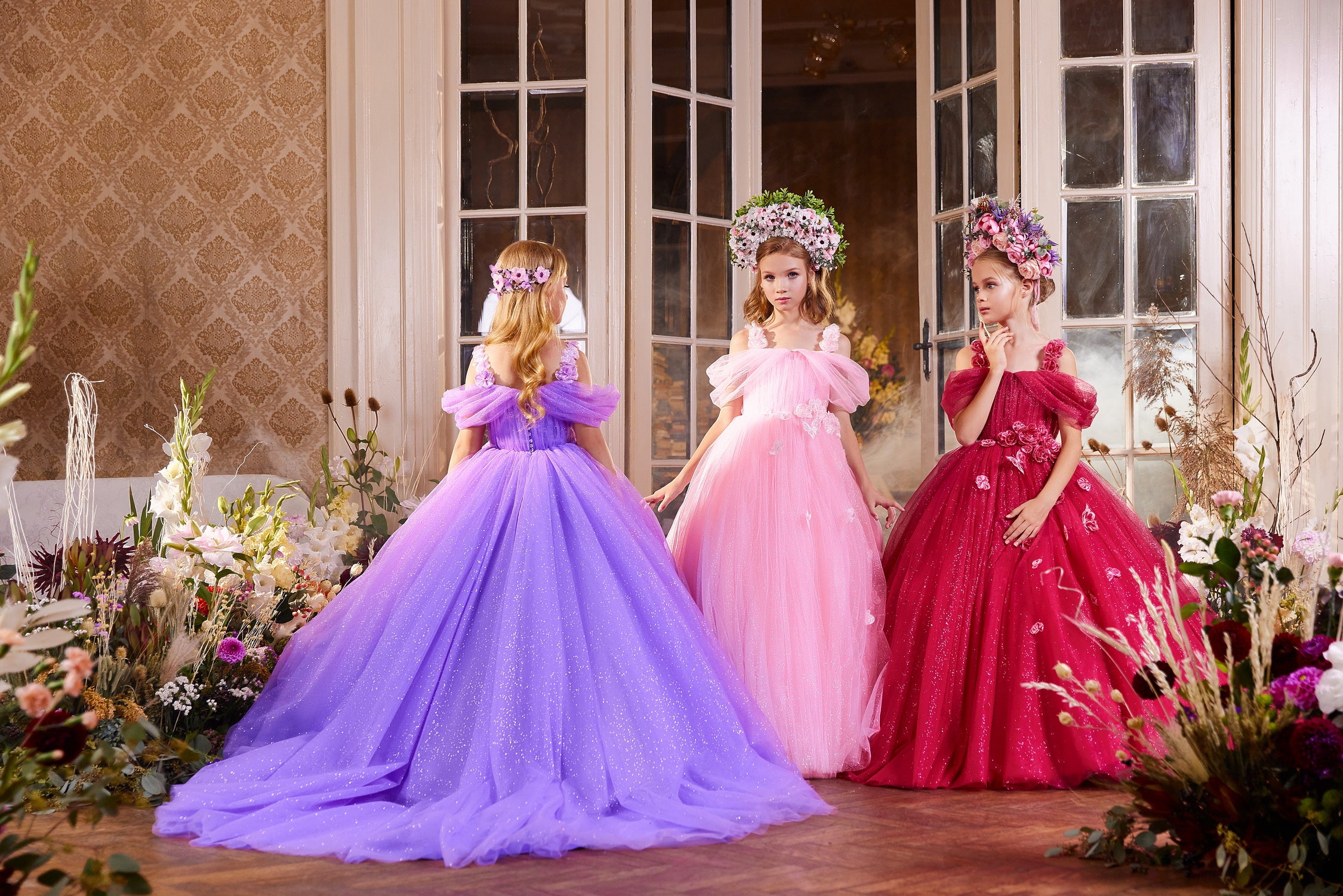 Pentelei Couture Ball Gown for Kids – Off-Shoulder Tulle Dress with Floral Appliqué Train