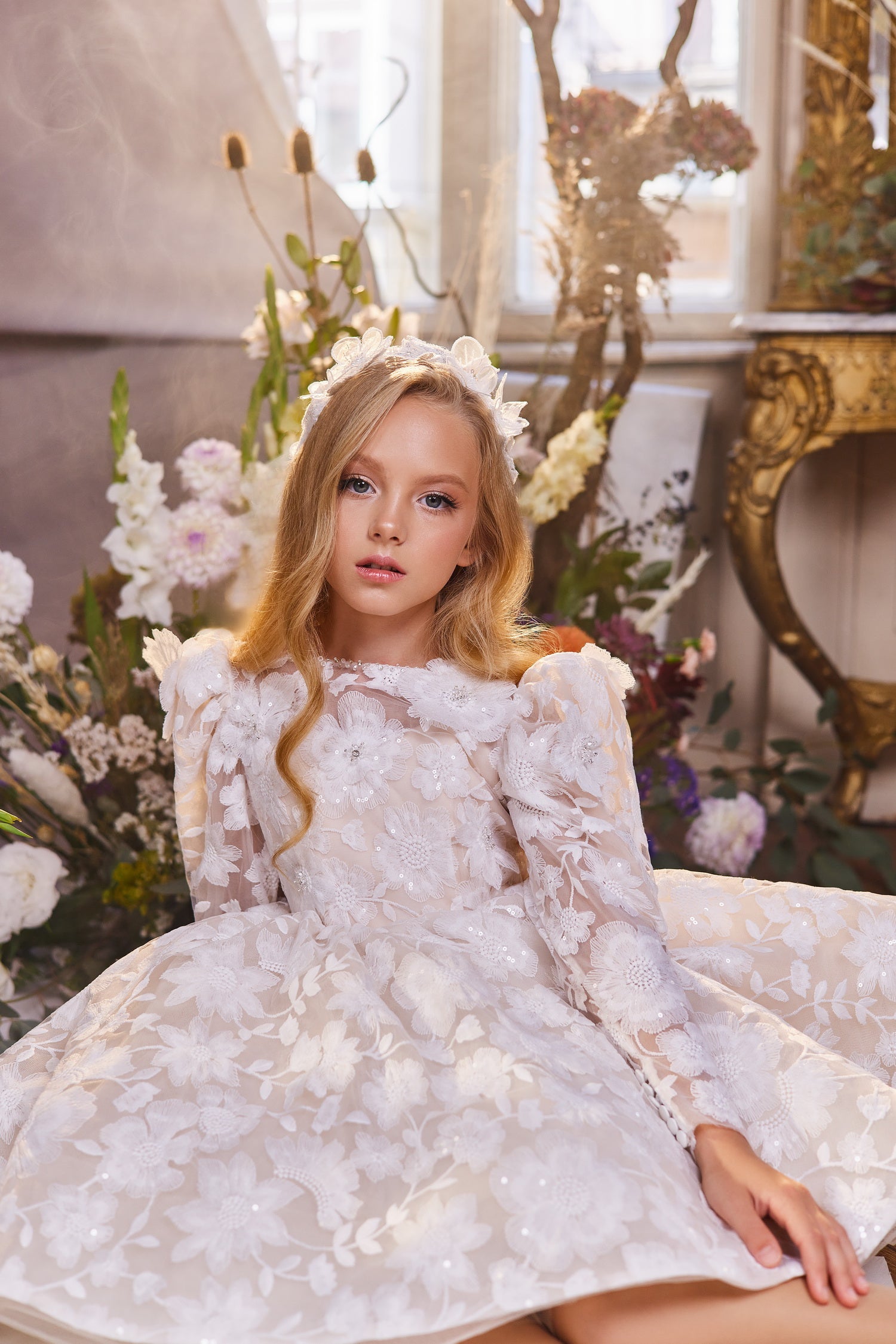 The back of the dress is equally detailed, with a row of delicate buttons that lead down to a slightly flared, knee-length skirt, perfect for twirling. Crafted for style and comfort, this dress is lined with a soft inner layer, ensuring your child feels as wonderful as she looks. The knee-length cut adds a modern and playful edge to a classic design, making it suitable for pageants, birthday parties, or formal celebrations. This piece is a true statement dress, combining luxury and youthful charm for any special moment.