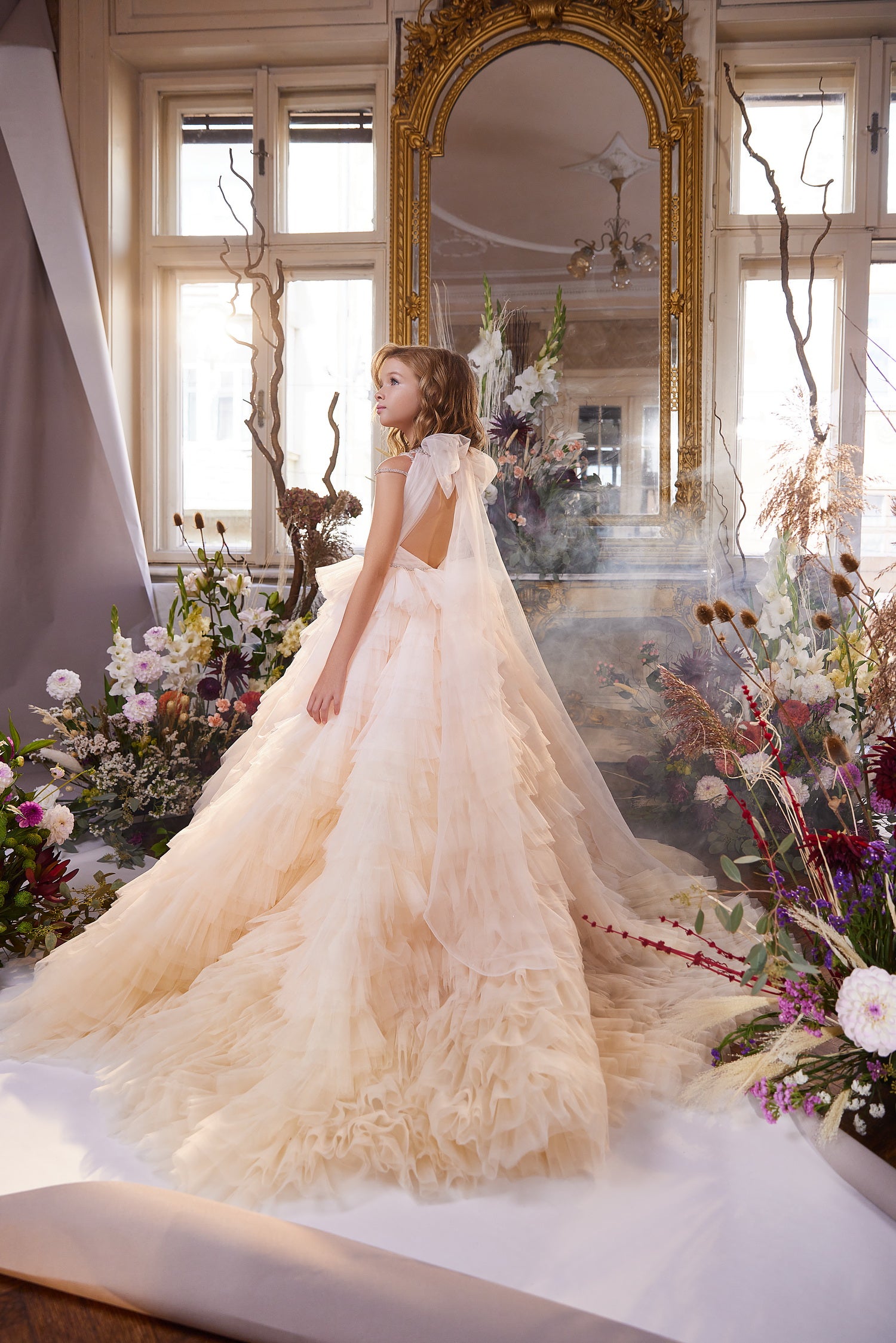 The attention to detail and high-quality craftsmanship make this dress ideal for weddings, pageants, and other formal occasions. Designed for both comfort and style, this Pentelei Couture gown ensures that your child will not only look stunning but feel confident and comfortable throughout the event. Whether it's the intricate beadwork or the cascading ruffles, every detail of this gown is crafted to impress and create lasting memories.