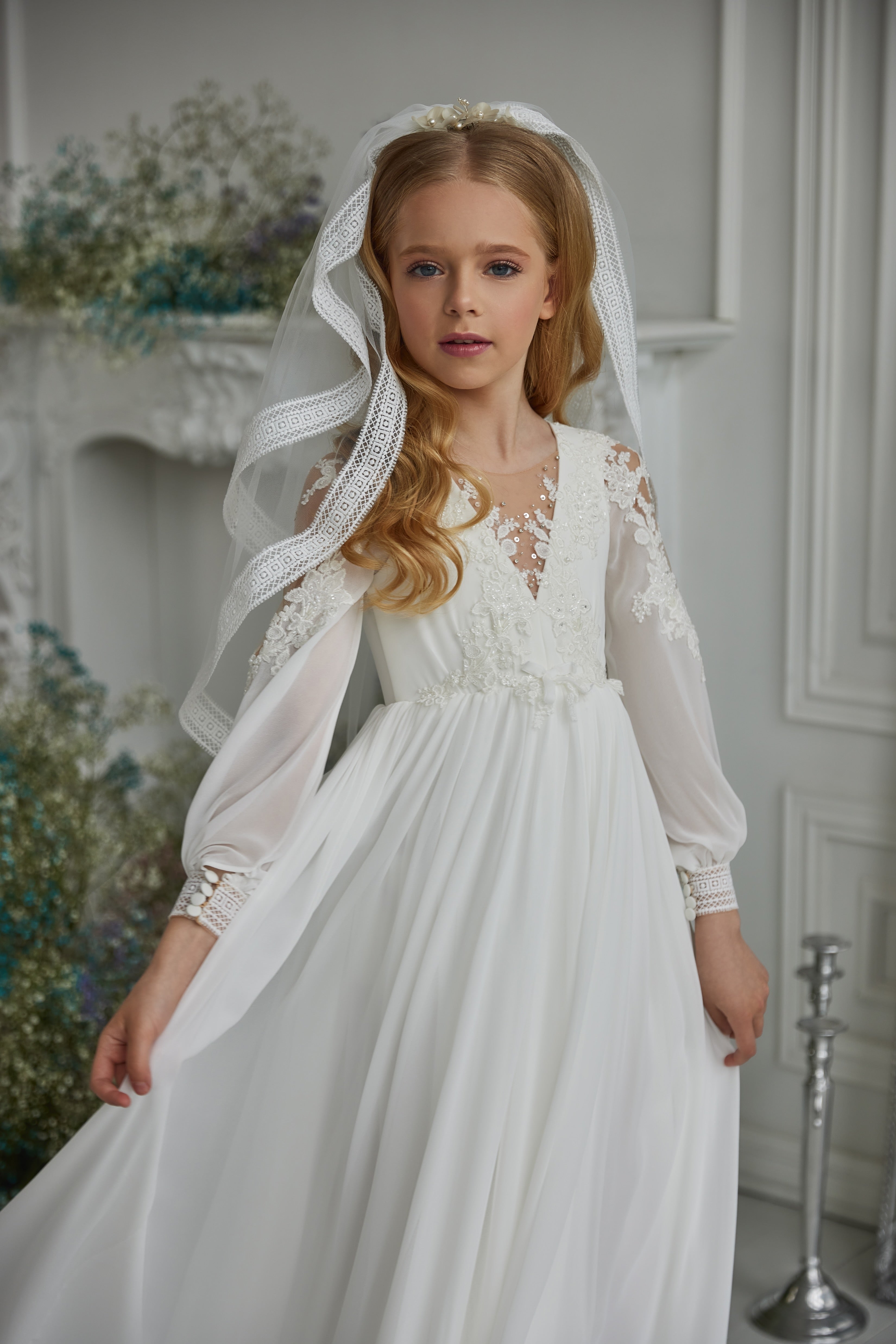The Pentelei Couture White Communion Dress is a timeless gown that blends elegance with couture craftsmanship. Featuring a flowing chiffon skirt with a soft ruffled hem, this dress is adorned with delicate lace embroidery along the bodice and sheer illusion long sleeves finished with lace cuffs. The deep V illusion neckline and button-up back create a graceful silhouette, while the lightweight fabric ensures comfort throughout the day. Perfect for first communion, christening, or as a flower girl gown, this design captures purity and sophistication in every detail. Veil shown can be added for an additional charge.
