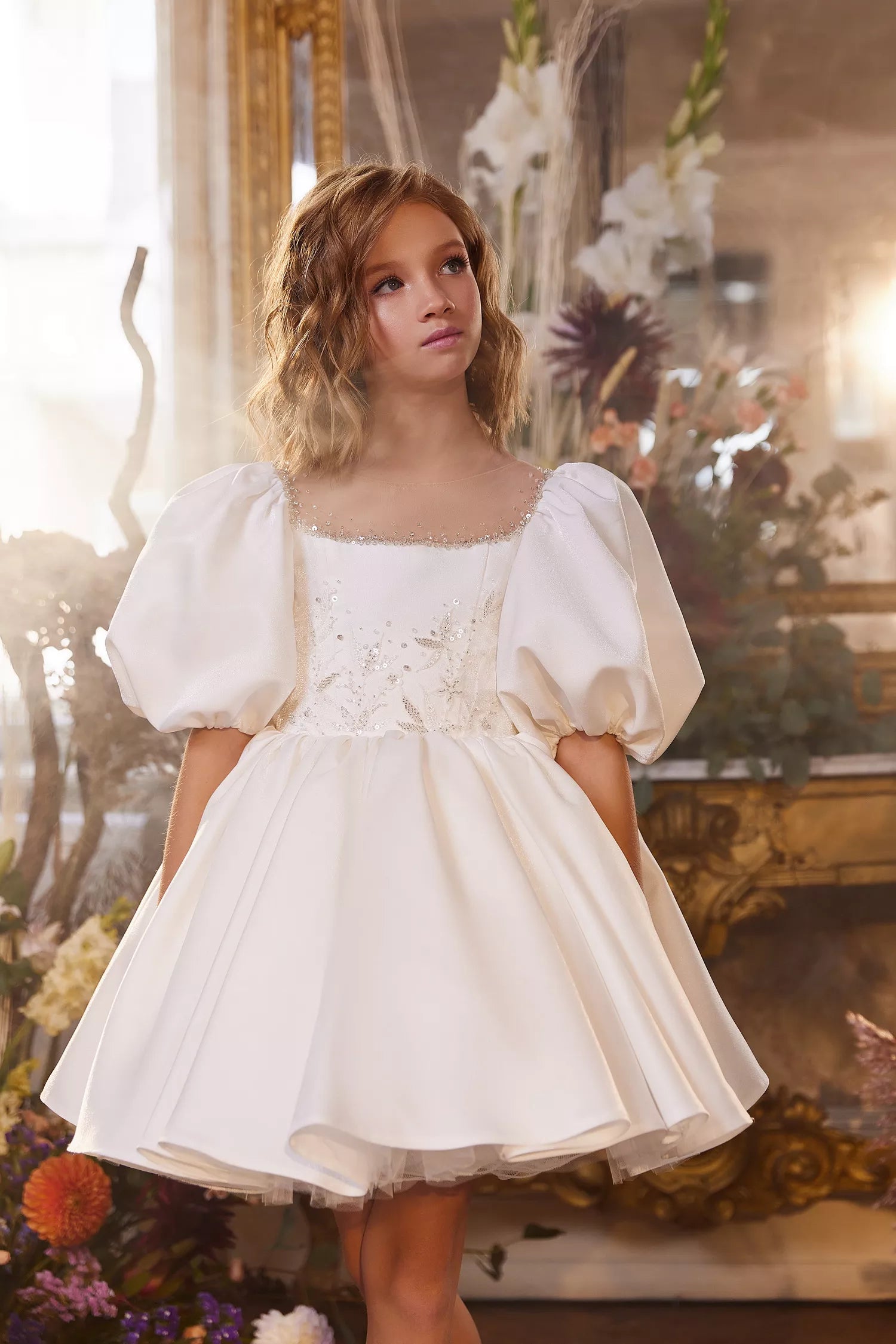 Elevate your little one's wardrobe with the Pentelei Couture White Puff-Sleeve A-Line Dress. This enchanting dress features a delicate beaded neckline, voluminous puff sleeves, and a gracefully flared skirt that embodies timeless charm. Perfect for special occasions, this dress ensures your child shines with elegance and poise. The dress's intricate details are designed to captivate from every angle, making it a standout piece for any celebration.