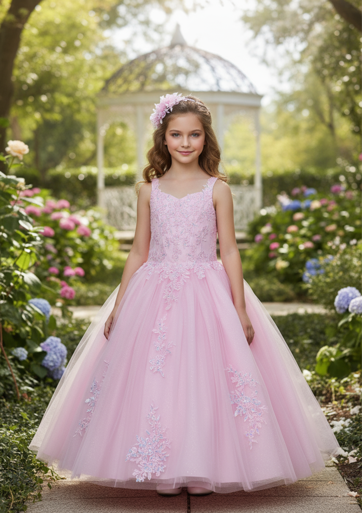 This Pink Embroidered Tulle Dress from Blush Kids captures timeless elegance with a soft sparkle. Designed with a lace-embellished bodice, delicate shoulder straps, and a full glitter tulle skirt adorned with floral appliqué, this gown is perfect for pageants, flower girl occasions, or any special celebration. The corset-style back ensures a comfortable and adjustable fit, while the pastel hue and flowing layers add a touch of fairytale charm. A stunning choice for the girl who loves a graceful, princess-like look.