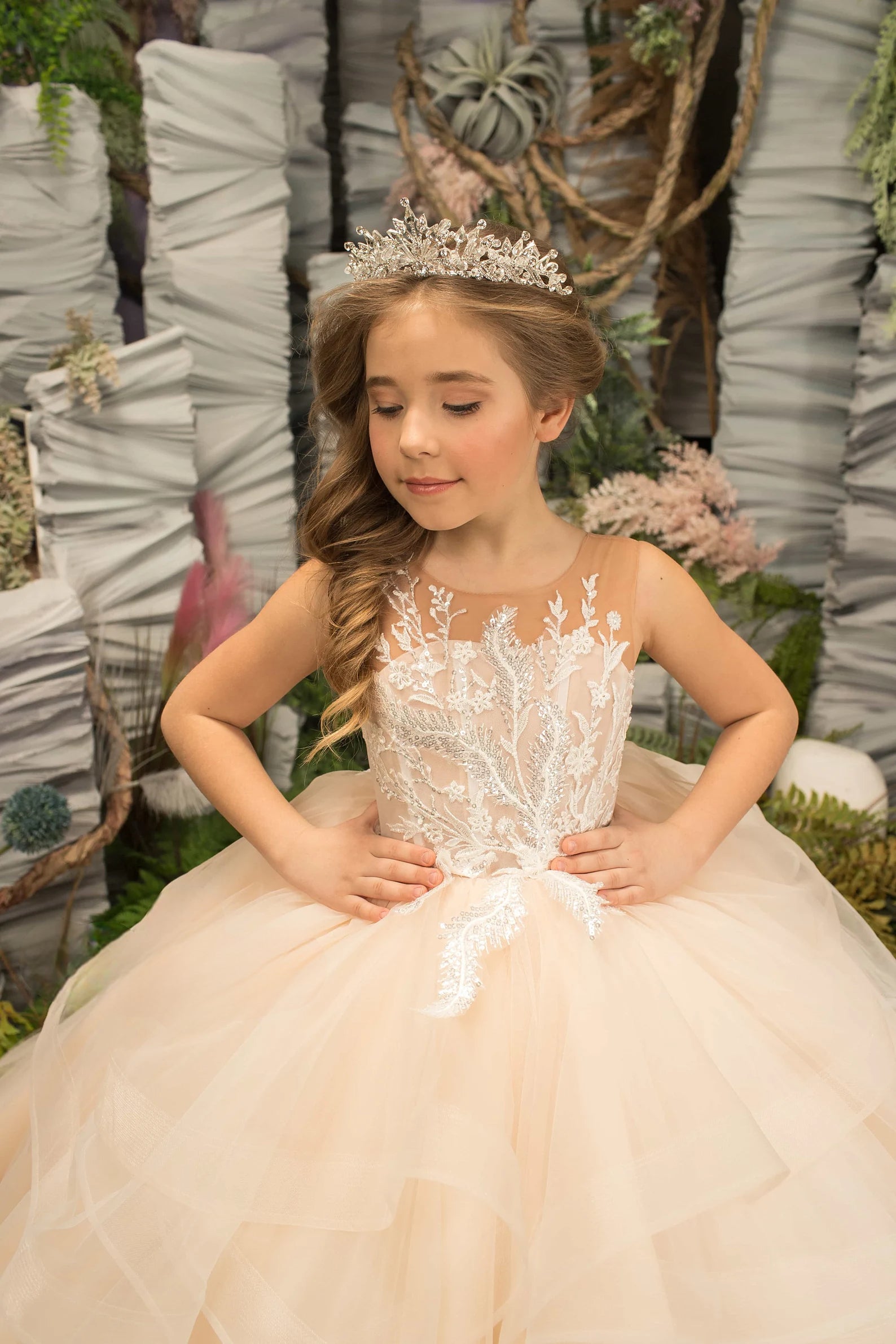 Step into a world of enchantment with the Piper Couture Tulle & Lace Flower Girl Gown! This exquisite gown features a sheer illusion neckline that adds a touch of elegance, while the crystal beaded lace appliqued bodice sparkles and shimmers with every movement. But the magic doesn't stop there – turn around and reveal the stunning embroidered lace detailing that cascades down the back of the floor-length ruffled skirt with a train.