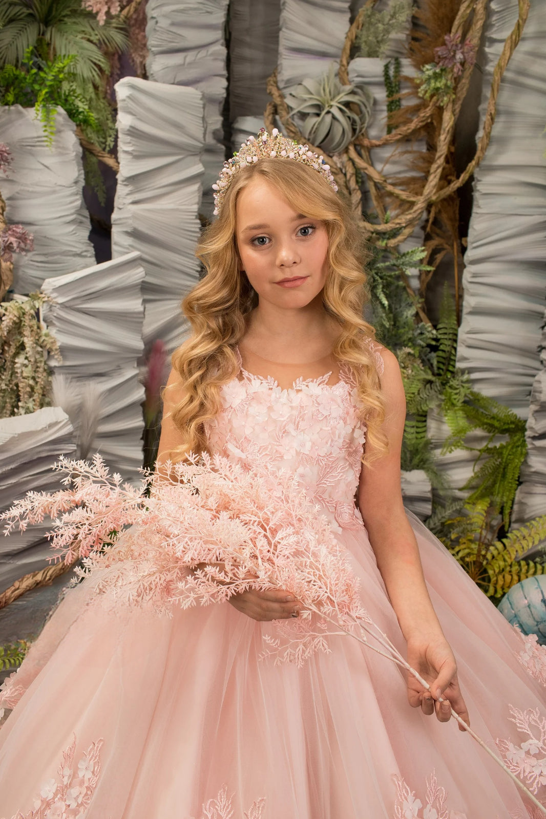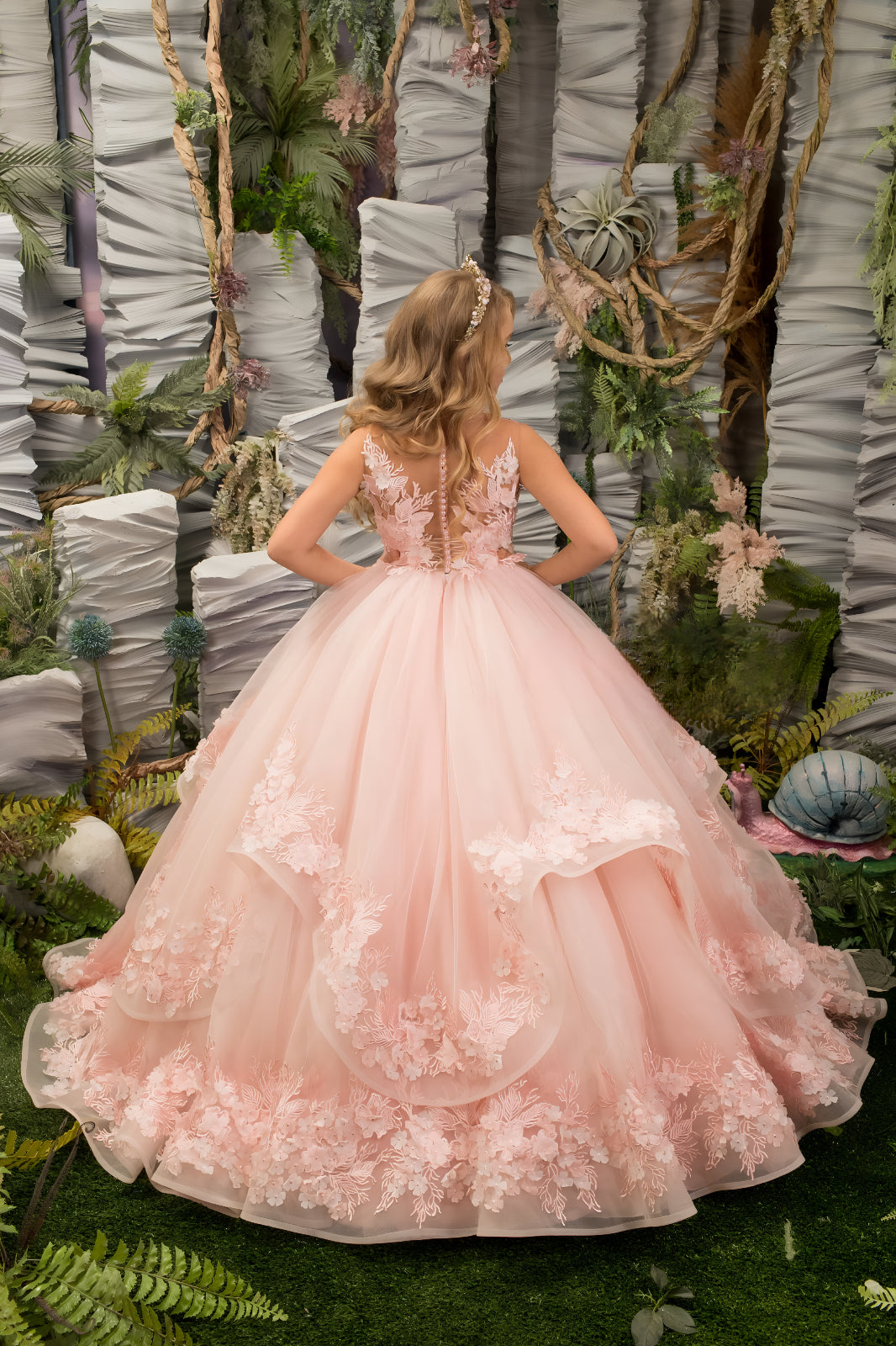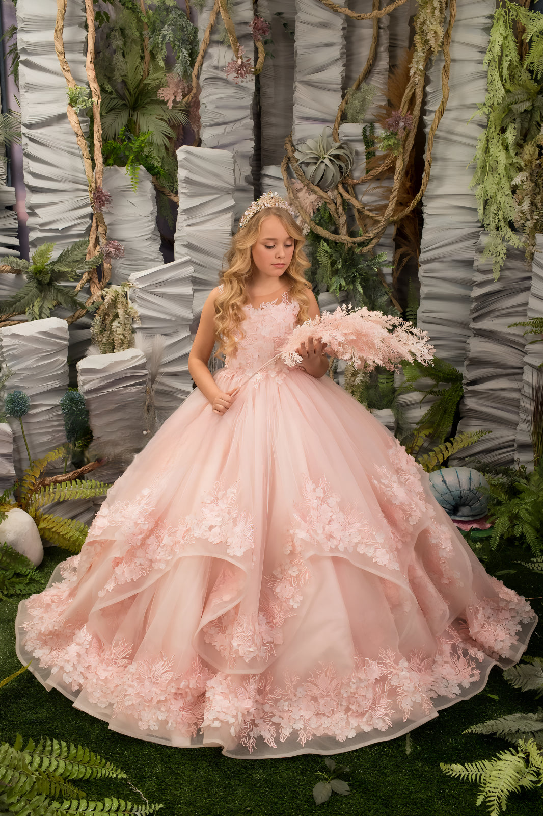 The Primrose Étoile Gown is a radiant statement of custom couture elegance. This dreamy blush pink with ivory lace creation features a full layered ball gown silhouette adorned with delicate floral appliqué and lace embroidery throughout. Cascading petals bloom from bodice to hem, while a soft illusion neckline and dramatic tiered skirt add dimension and ethereal charm. The back showcases a sheer button-down finish with blooming vine motifs, creating a magical garden-like effect. Perfect for pageants, luxury birthdays, or fairytale flower girl moments, this gown is handcrafted for the girl who deserves to shine like a star.
