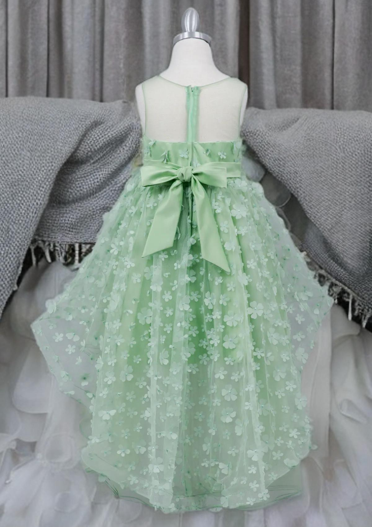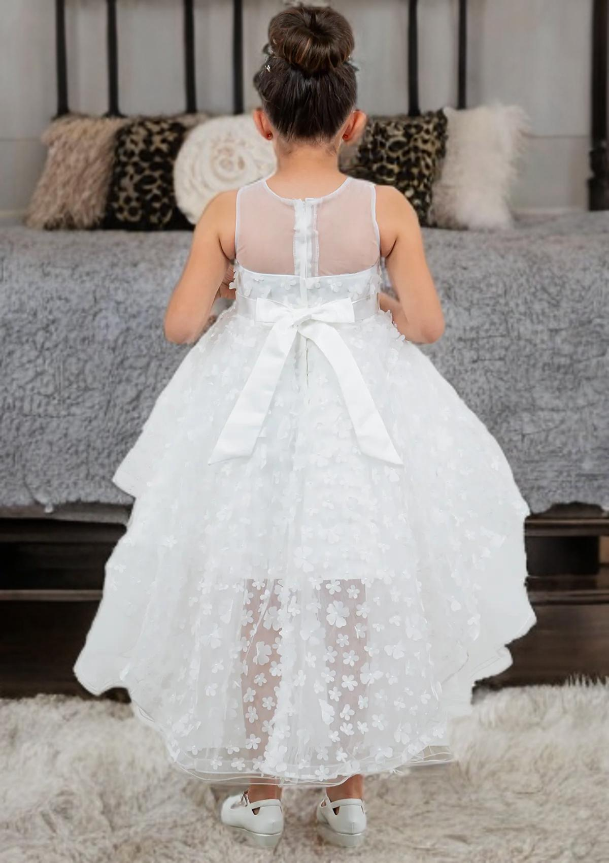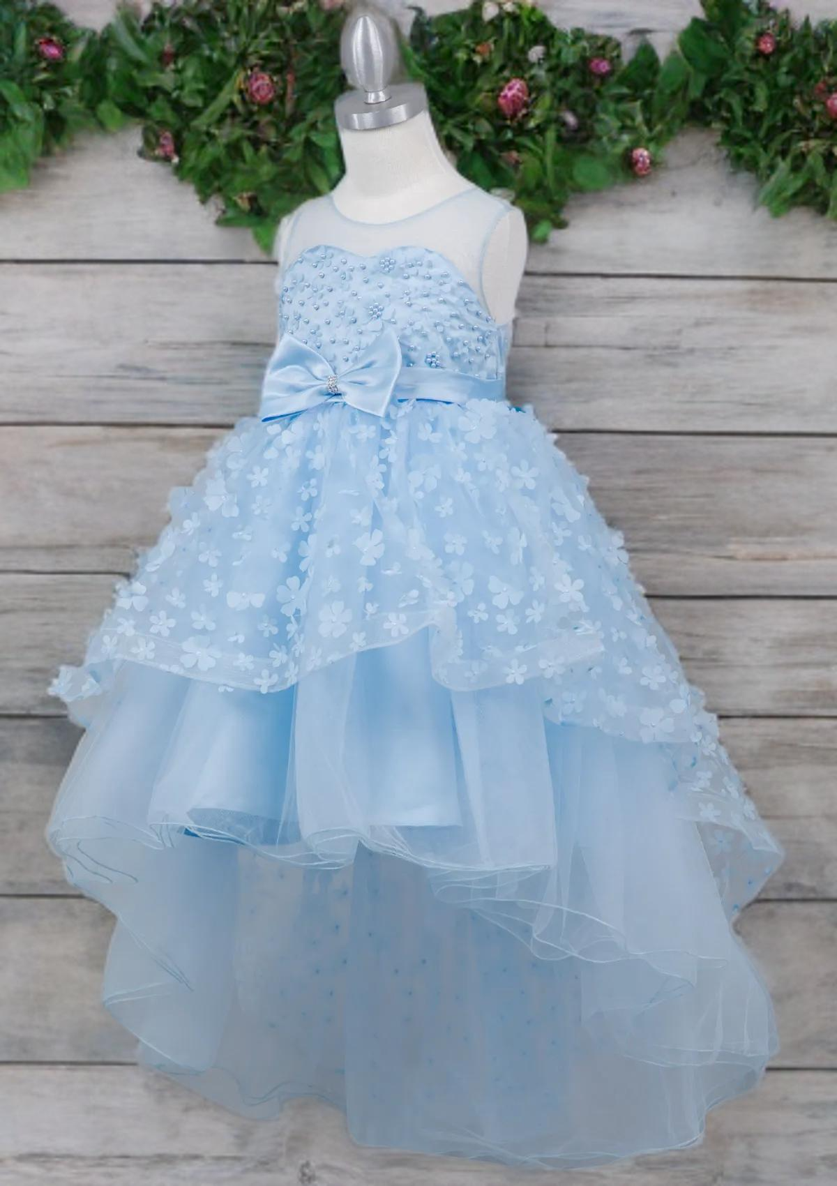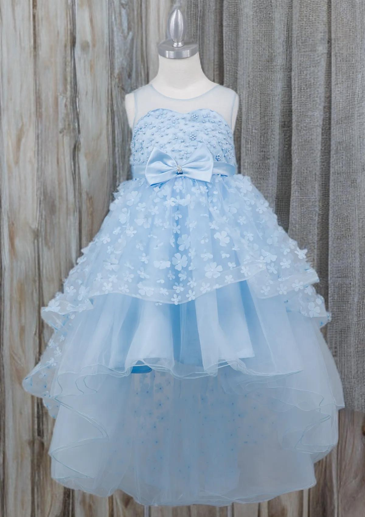 Bring whimsical charm and elegance to her next special occasion with our Dahlia Bloom Dress from the Blush Collection. This stunning dusty pink hi-low party dress features dimensional floral appliqués, a sheer illusion neckline, and a statement satin bow at the waist for that picture-perfect princess look. The layered tulle skirt adds volume and grace, making it ideal for birthdays, pageants, flower girl duties, and father-daughter dances. Designed for comfort and style, this dress ensures she shines bright at every celebration. This dress comes in several gorgeous colors.
