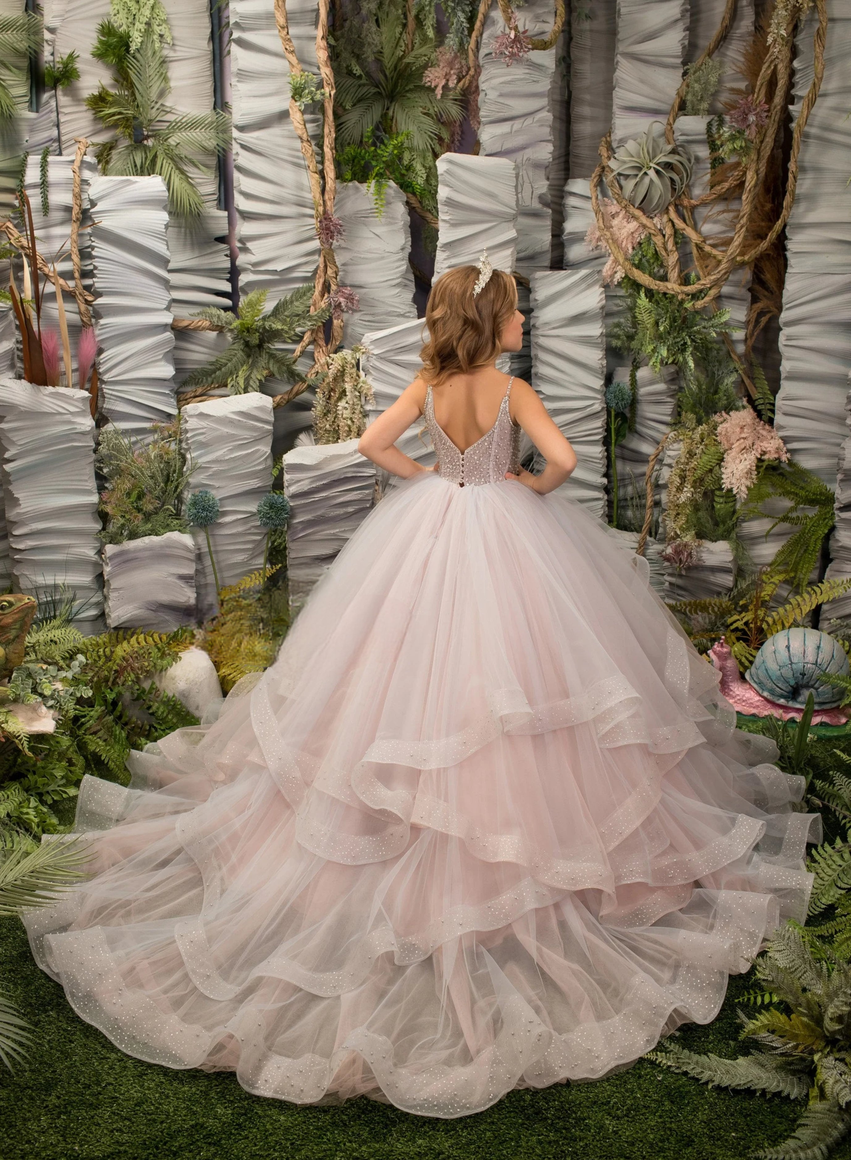Make a grand entrance in our Rosalie Gown, a breathtaking Fashion Couture design crafted for pageants, portraits, and luxury events. This show-stopping blush pink and gray dress features a fully hand-beaded bodice with a delicate sheer illusion neckline, cascading into a voluminous tiered glitter tulle skirt trimmed in sparkle. The back reveals a romantic V-cut with crystal button detail, adding a regal finish. A true fairytale masterpiece for girls who deserve to shine.