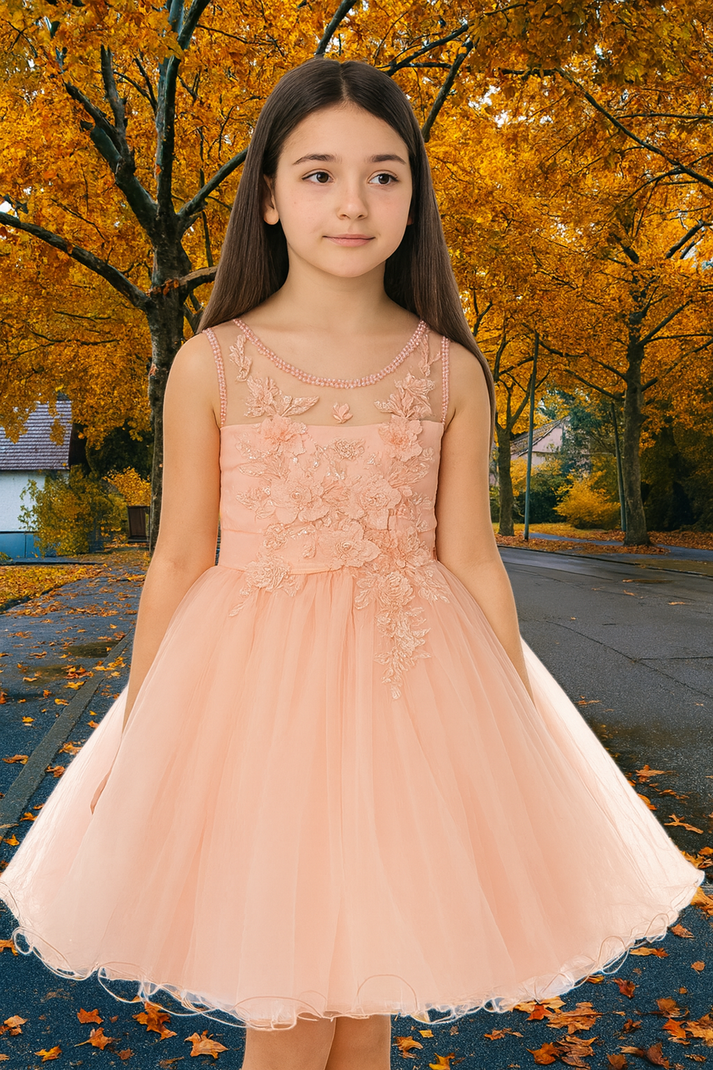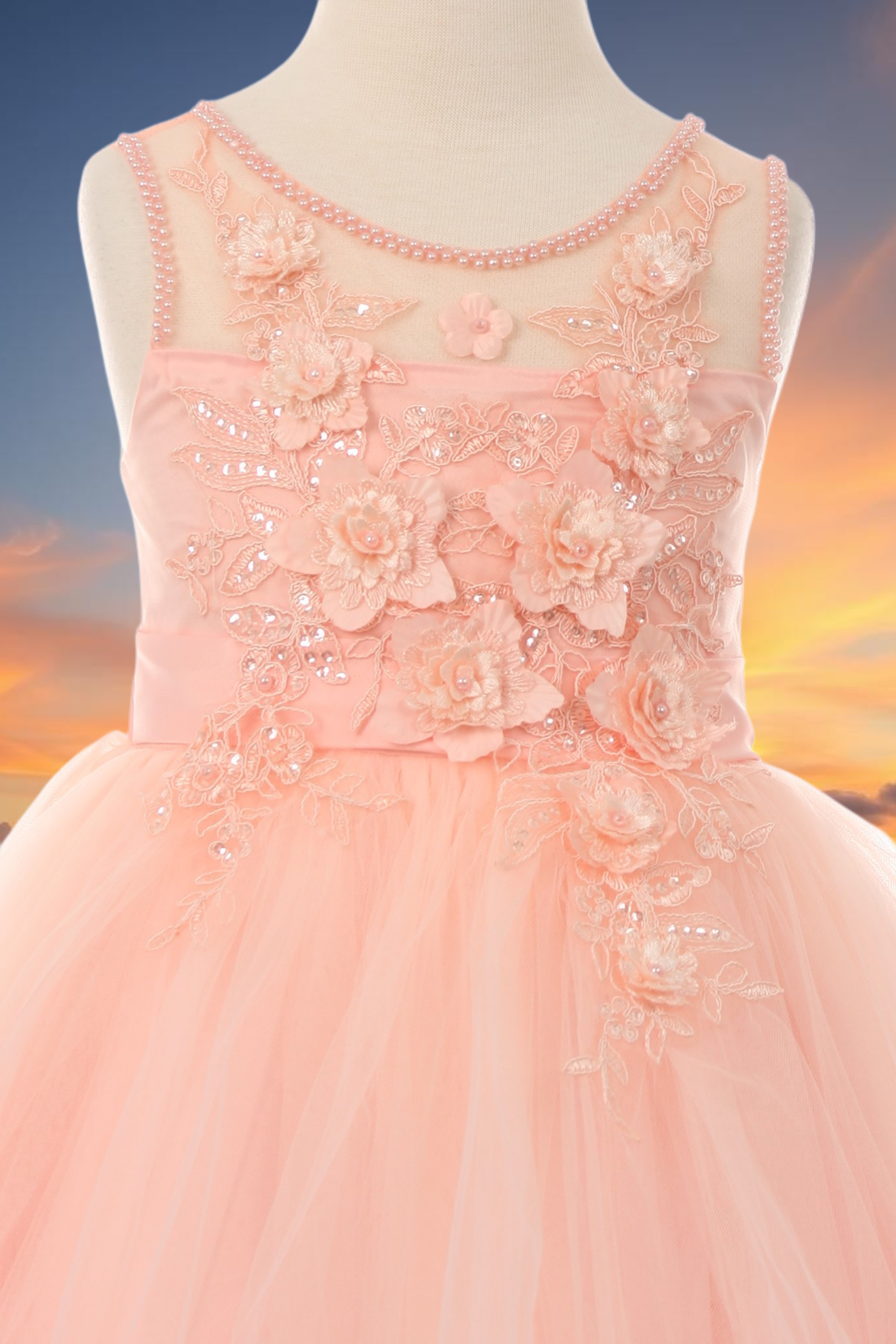 The Rosalie Pink Floral Tulle Dress is a picture of elegance and charm, designed to make every young girl feel like a princess. Featuring a sheer neckline delicately trimmed with pearls and an intricately embroidered bodice adorned with 3D floral appliqués, this dress radiates sophistication. The full tulle skirt flows gracefully, perfect for twirling moments at communions, flower girl entrances, birthday celebrations, and pageants. Its timeless blush-pink shade flatters beautifully, making it a versatile choice for every memorable occasion.