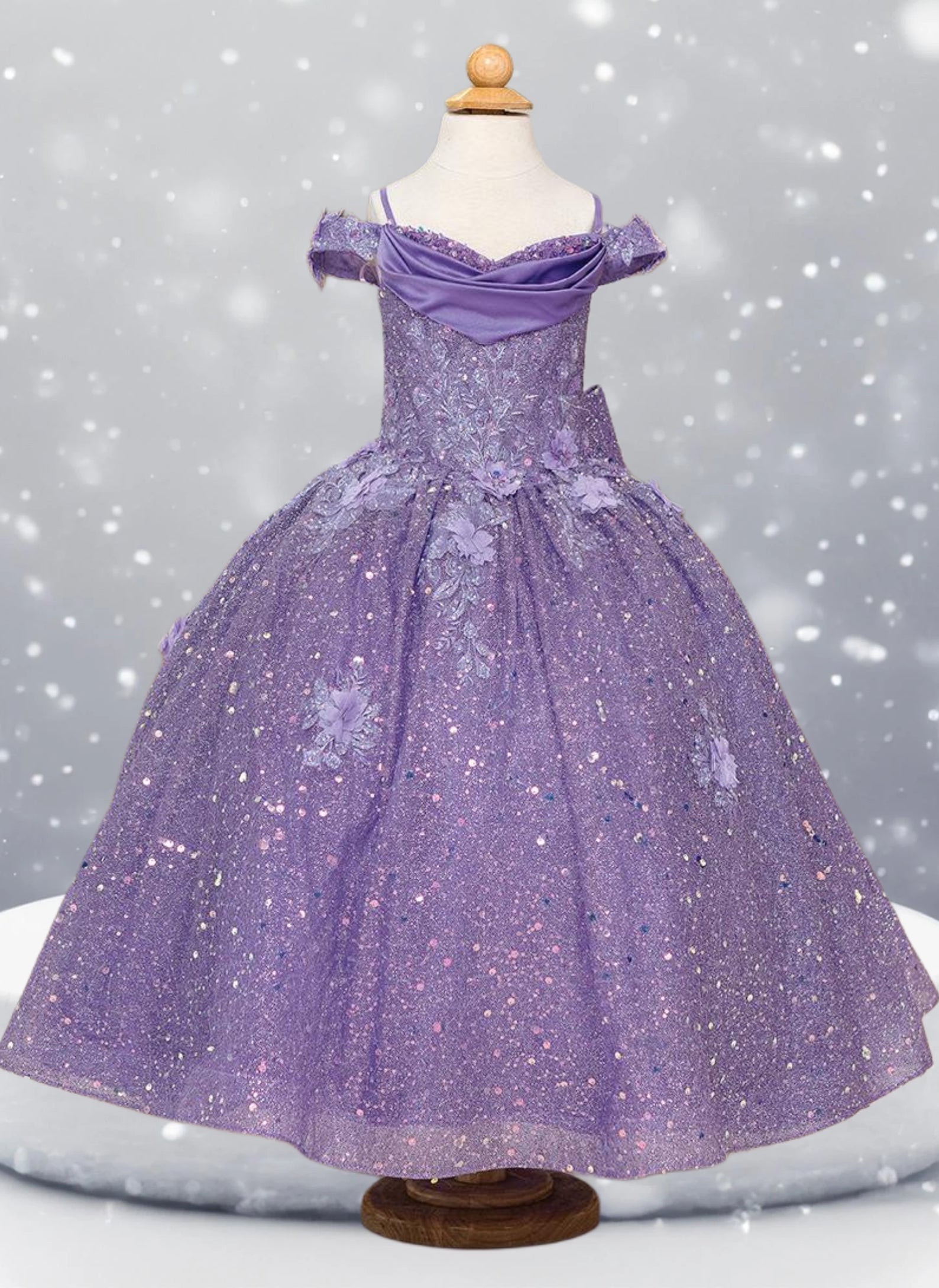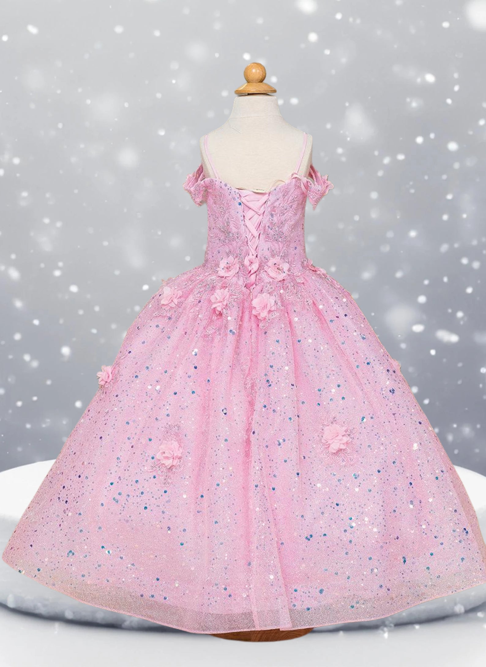 Step into a fairytale with the Rosalina Petal Sparkle Gown—a dreamy pink creation made for magical moments. This enchanting gown features a glitter-infused tulle overlay that sparkles with every twirl, while delicate 3D floral appliqués bloom across the voluminous skirt. The off-shoulder ruffled sleeves, sweetheart bodice, and corset-style lace-up back complete the princess-perfect look. Designed for birthdays, pageants, flower girl appearances, or any special celebration, this gown brings a burst of beauty to every event—without the couture price tag.