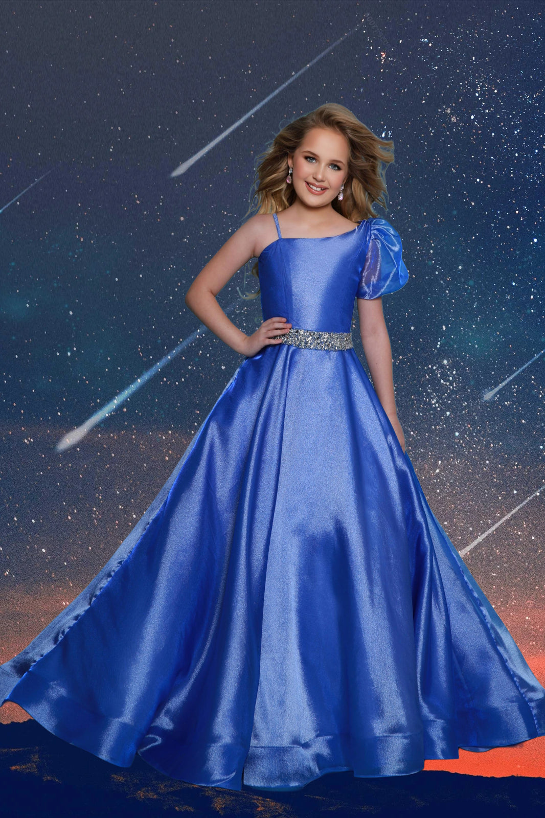 Make a dazzling entrance in this 2Cute Collection showstopper, available in radiant royal or vibrant hot pink. Designed with a one-shoulder neckline and sheer puff sleeve, this dress exudes modern fairytale charm. A shimmering waistband cinches the satin bodice above a flowing full-length skirt, delivering classic elegance with a playful twist. Whether she's attending a birthday party, father daughter dance, or a pageant, this gown ensures she’ll turn heads and shine with confidence.