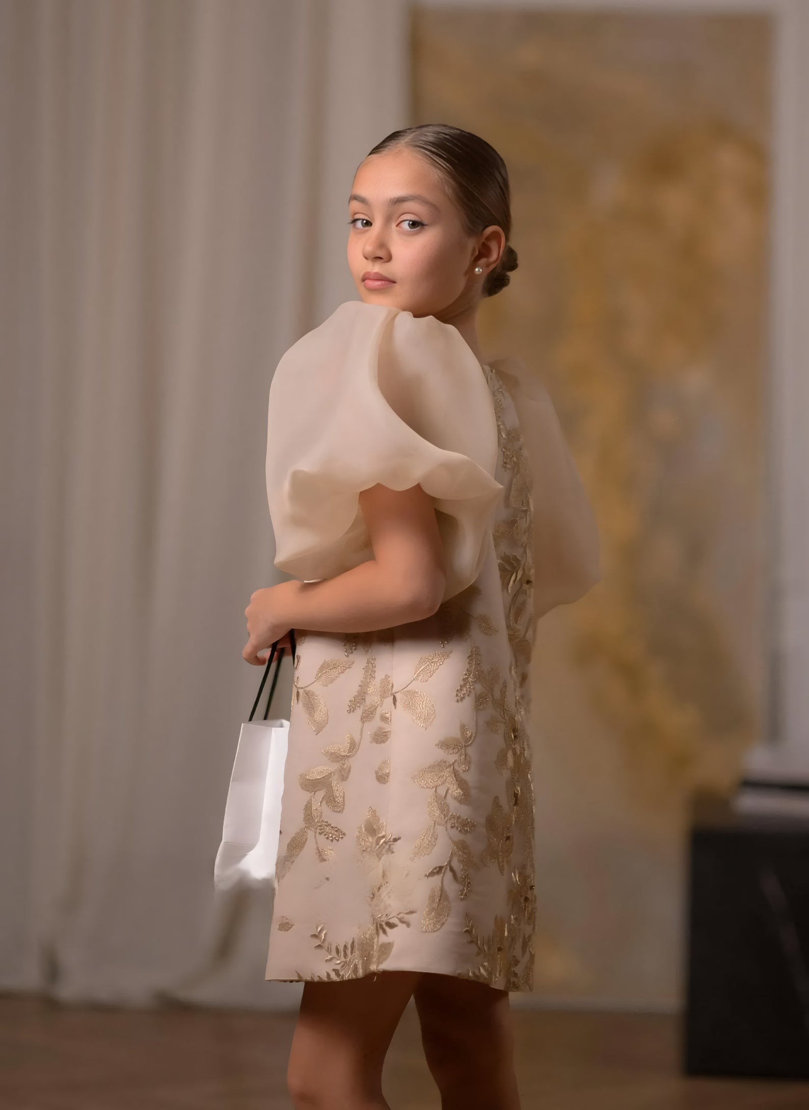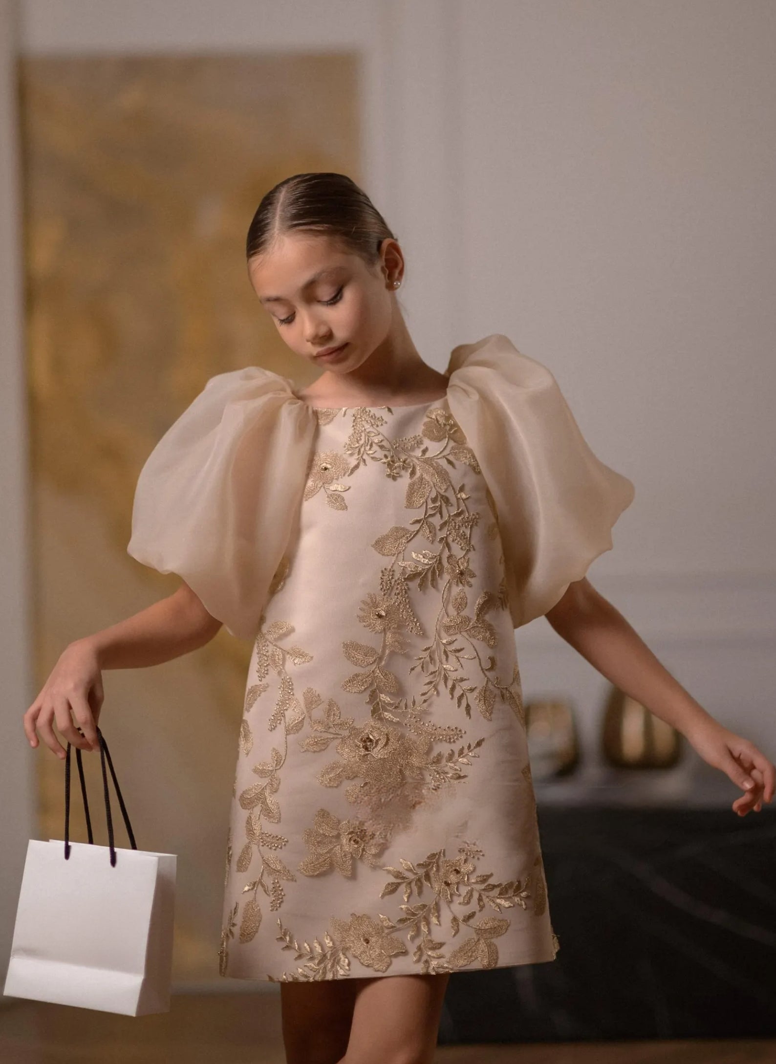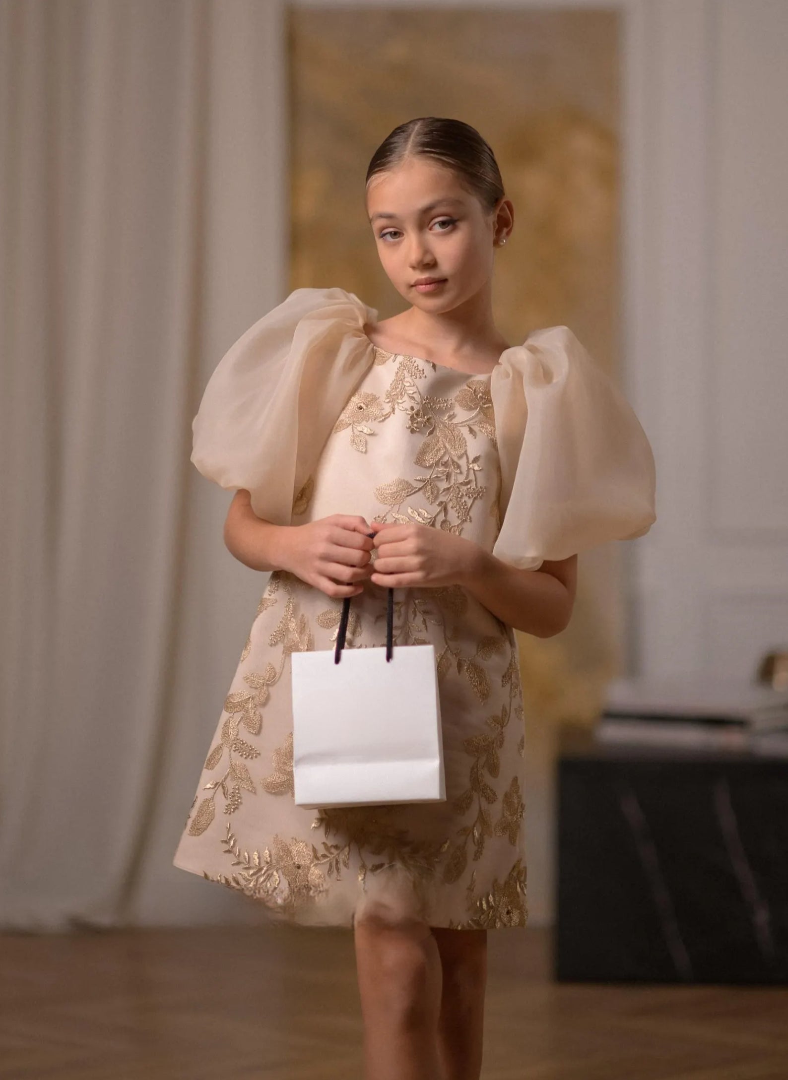 A vision of timeless charm, the Sabrina Bloom Dress showcases elegant taupe satin layered with gold floral embroidery and airy organza puff sleeves. This mini couture silhouette is perfect for sophisticated celebrations—from weddings to formal parties—exuding regal grace in a modern cut. The delicate embroidery pairs with dramatic sleeves to create a couture statement for young fashionistas. Fabric & Materials: Satin, Lace, Organza. 100% handmade, no glue, no chemical odors, no itchy or skin irritating materials.