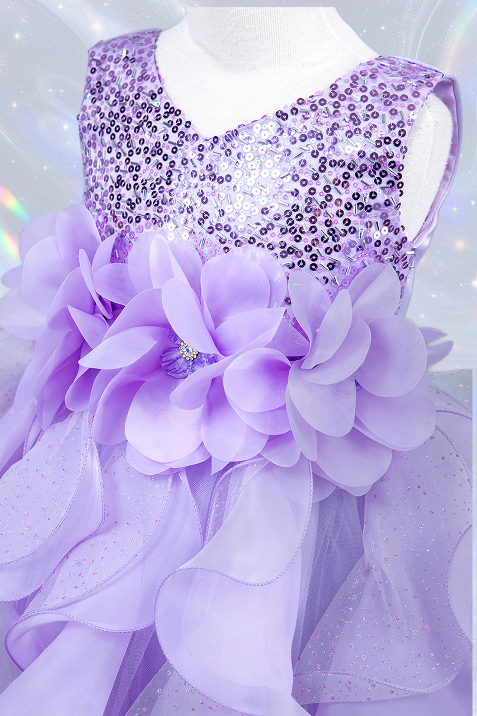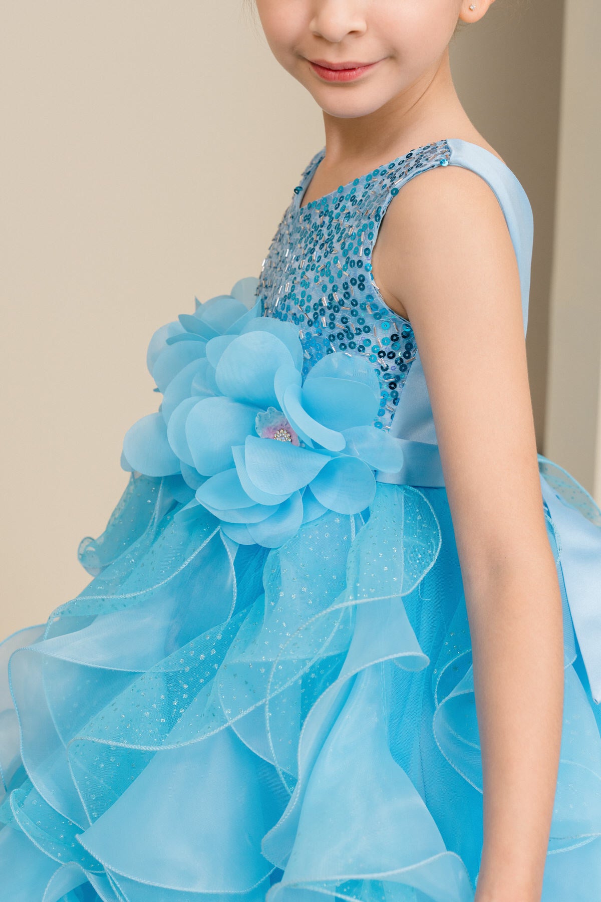 Turn every special occasion into a fairytale with our Sequin Ruffle Girls Pageant Dress, available in brilliant Blue, enchanting Lilac, or romantic Rose. This dazzling gown features a shimmering sequin bodice that catches the light beautifully, paired with a voluminous layered ruffle skirt adorned with glitter accents for a truly magical effect. A large floral waist detail adds an extra touch of drama, making this the perfect choice for pageants, birthdays, flower girl moments, or any unforgettable event. Designed for comfort as well as style, the dress is fully lined and tailored for a flattering fit that allows easy movement for dancing and twirling. Parents love the durability and elegant detailing, while girls love feeling like the star of the day.