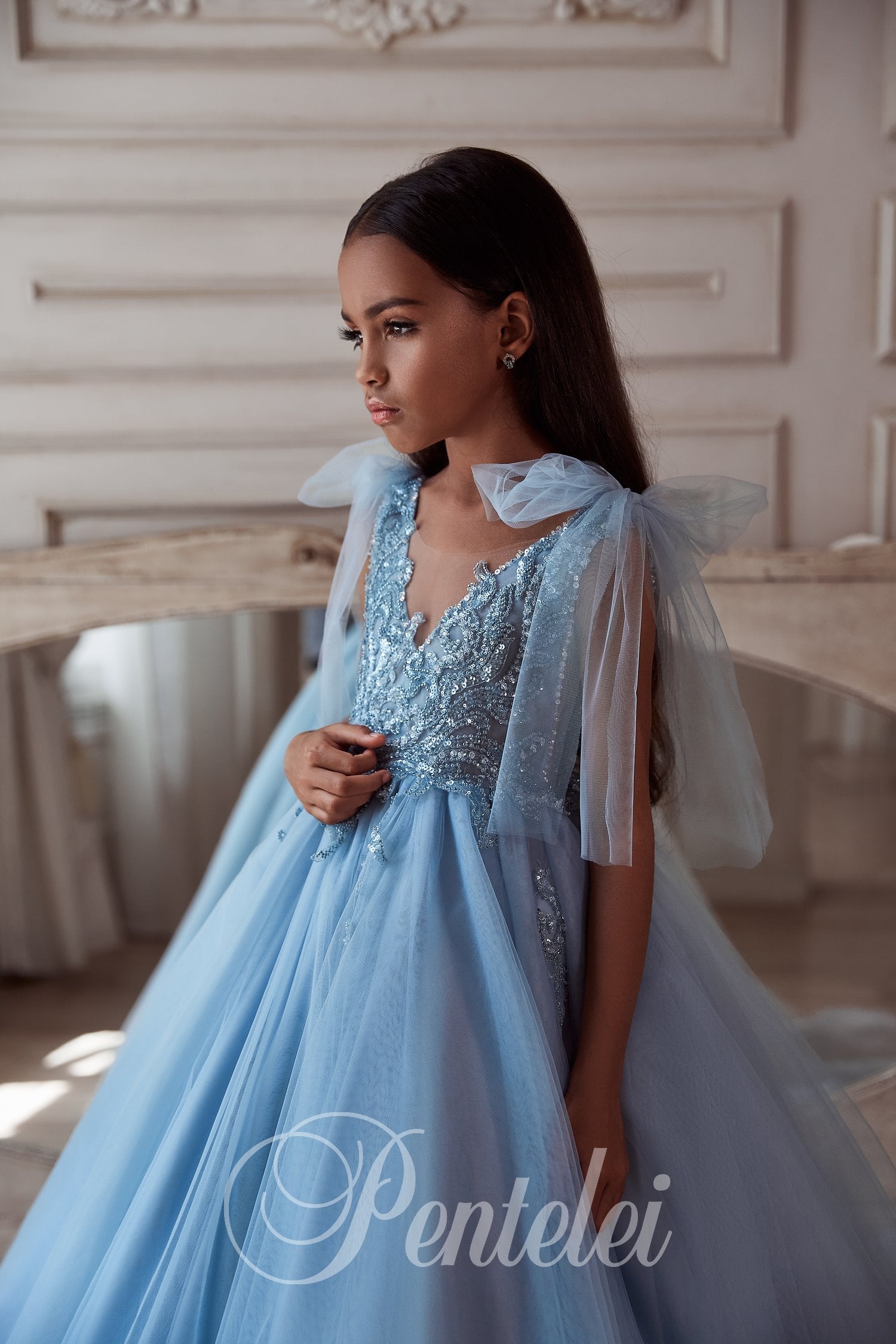 A breathtaking vision in soft powder blue, the Seraphina Blue Pentelei Couture Gown captures timeless fairytale elegance for the modern young debutante. This full-length couture masterpiece features a voluminous layered tulle skirt that flows effortlessly from a hand-beaded bodice adorned with delicate sequin embroidery. The ethereal tulle shoulder bows add a whimsical finish, while the deep V-back adds a hint of refined drama. Perfect for formal galas, flower girl moments, or unforgettable birthday celebrations, this gown is designed to leave a lasting impression. Custom fit options available for a flawless silhouette.