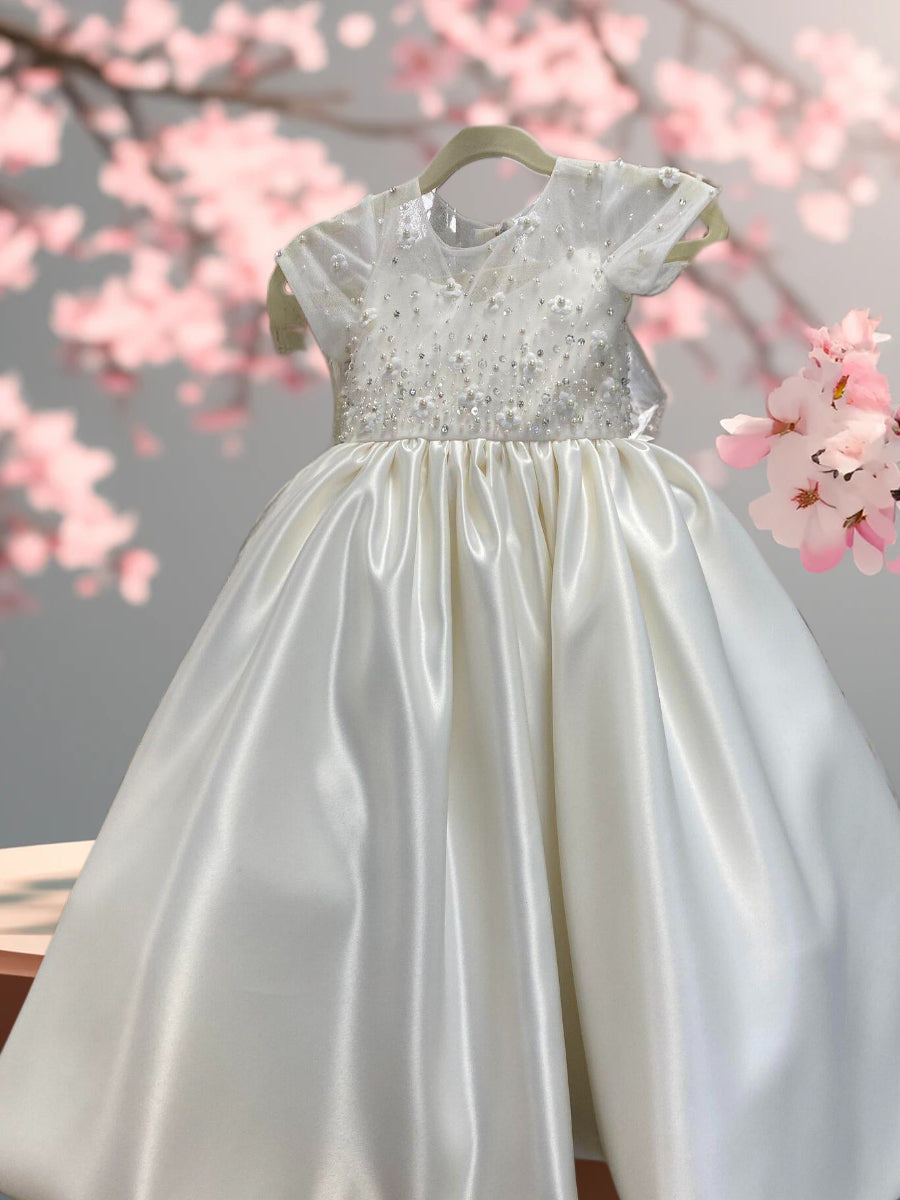 The Seraphina Star Satin Dress by Amalee Couture is a radiant statement piece, designed to shimmer with every step. Crafted from luminous satin, this gown features a voluminous skirt and structured silhouette, perfectly balanced by a soft illusion bodice adorned with scattered crystals and tiny floral appliqués. The cap sleeves and sparkling accents make it ideal for girls who love a touch of fairy-tale magic. An impeccable choice for First Communion, flower girls, portraits, pageants, or upscale celebrations. Available in Ivory or White, with custom sizing for an unforgettable fit and finish. Every detail of the Seraphina dress is made to dazzle—from ceremony to celebration.