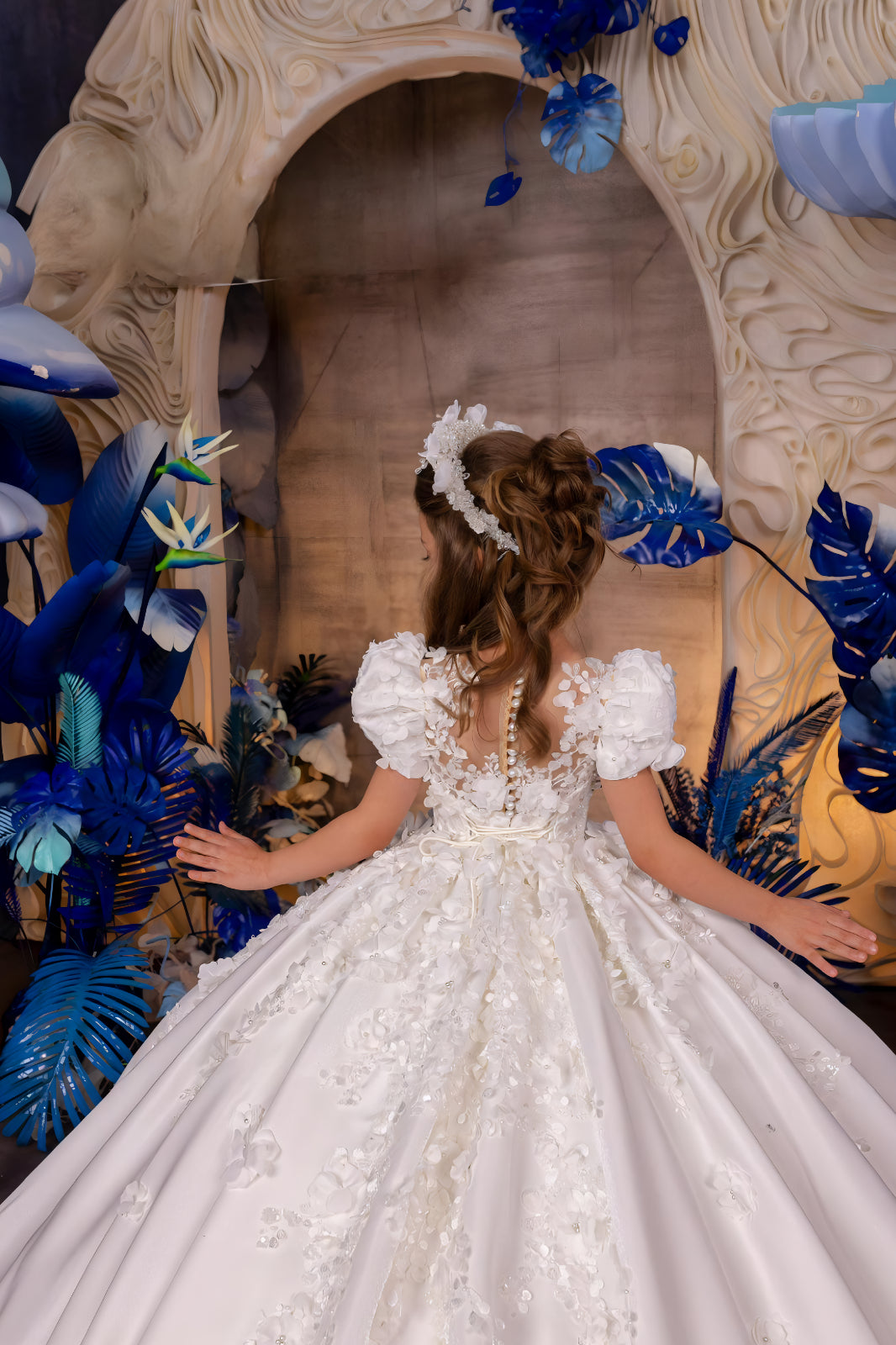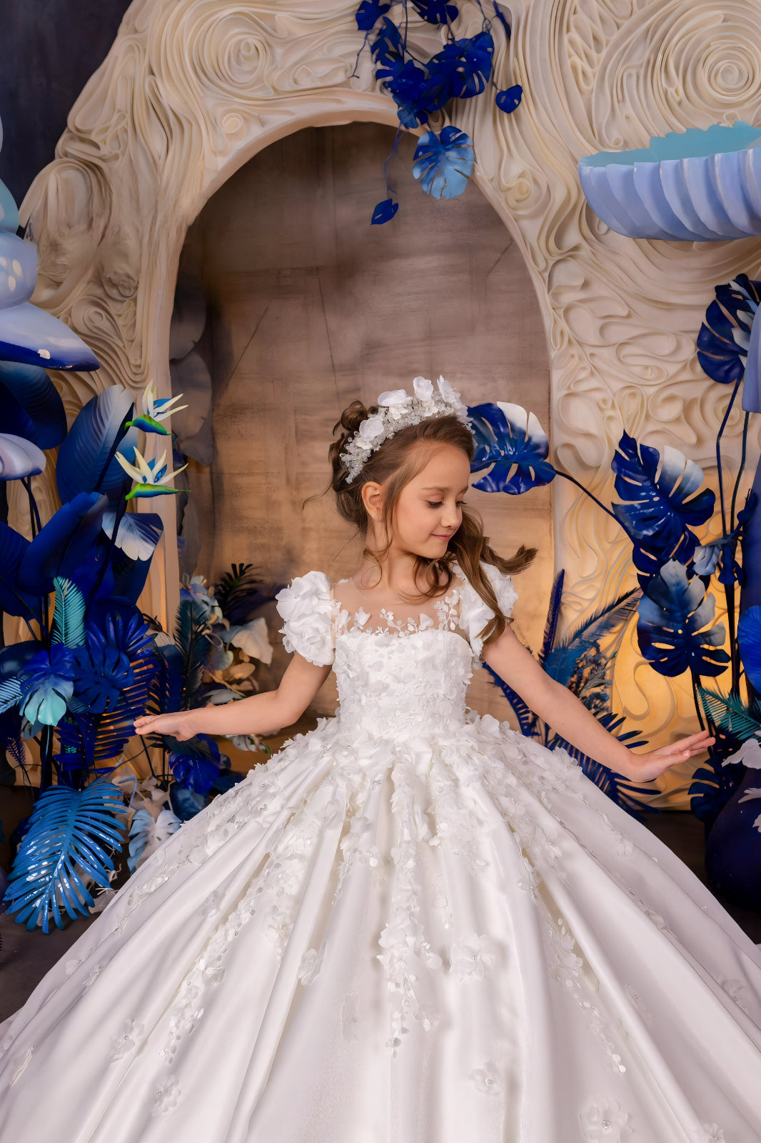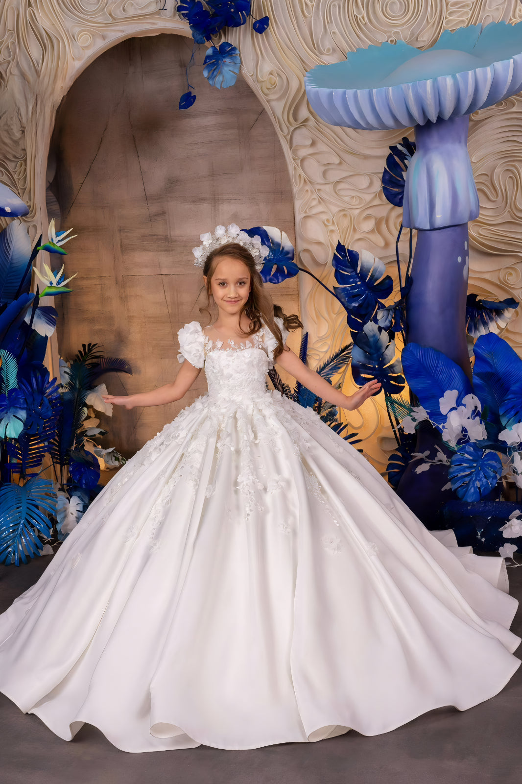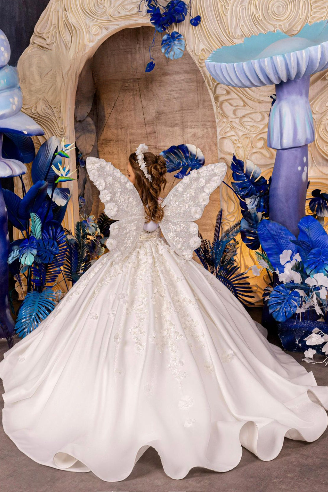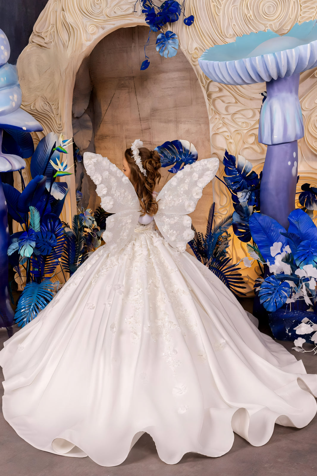 The Serenalia Couture Gown is the epitome of timeless elegance, crafted for moments that deserve nothing but the best. Made from luminous white satin, this full-length couture gown features intricate 3D floral appliqué and delicate beading that gracefully embellish the bodice and skirt. Soft puff sleeves and a refined illusion neckline bring an air of classic romance, while the full ball gown silhouette creates a regal, show-stopping presence. Perfect for first communion, flower girl appearances, pageants, or unforgettable father-daughter dances, Serenalia is designed to leave a lasting impression at every special occasion. Please note: The moving wings shown in some photos are sold separately and not included with the gown.