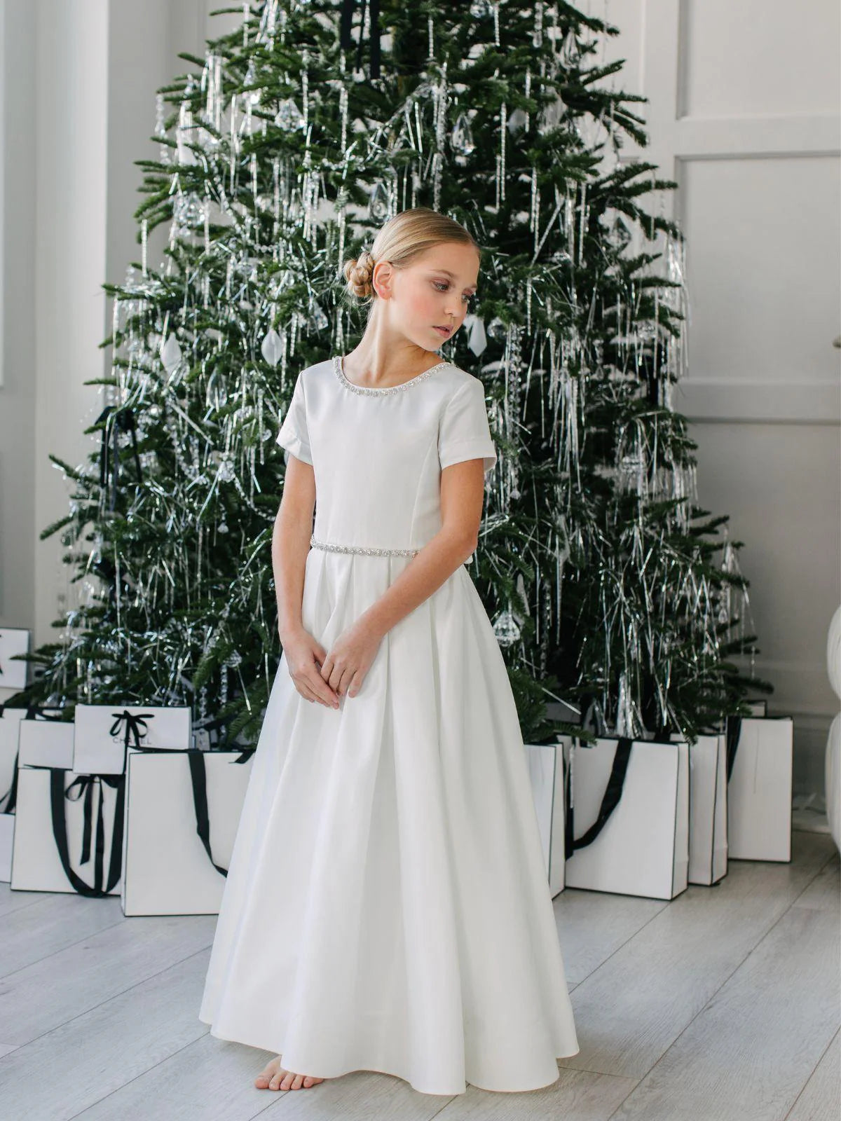 Elevate her first communion with the Serenelle Grace Gown, a stunning couture dress exclusively from Blush Kids. Crafted from luxurious satin with a softly structured silhouette, this elegant gown features delicate crystal beading along the neckline and waist, short sleeves, and a graceful full skirt that drapes beautifully for photos and special moments. The subtle bow detail at the back adds a timeless touch of charm, while discreet pockets offer both style and practicality. Perfect for first communion, flower girl, or any cherished occasion where she deserves to shine.