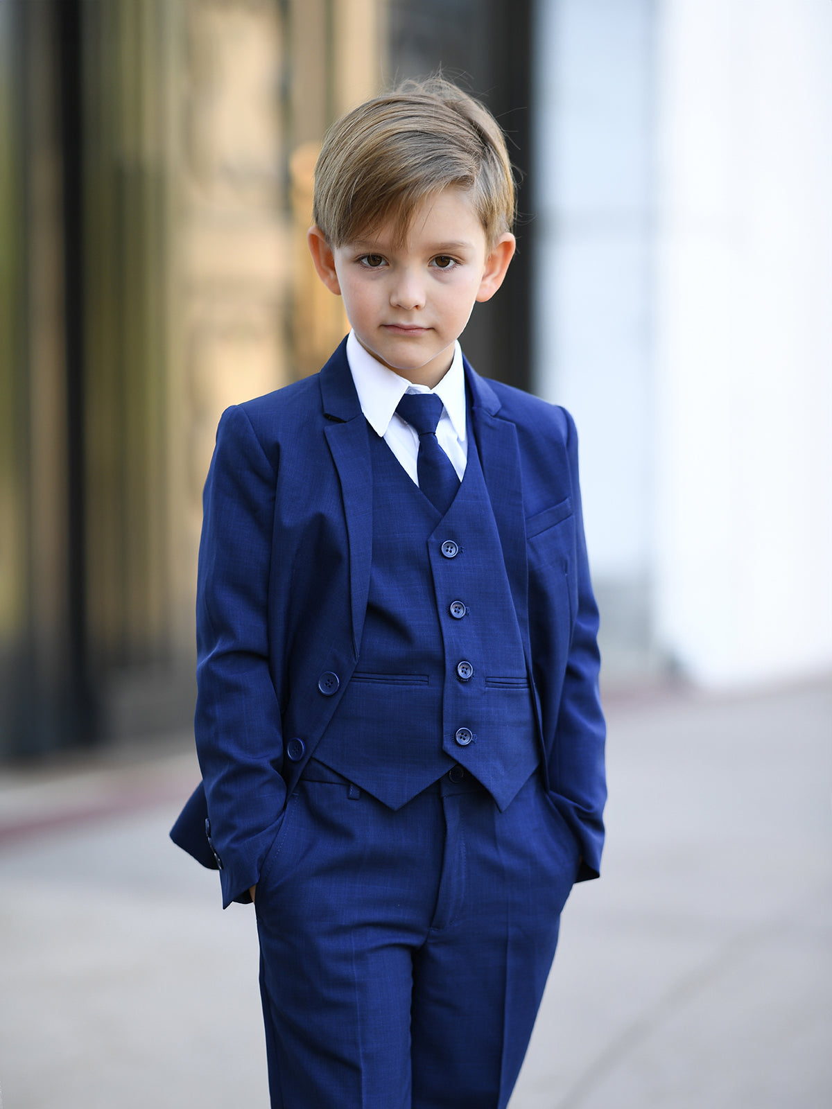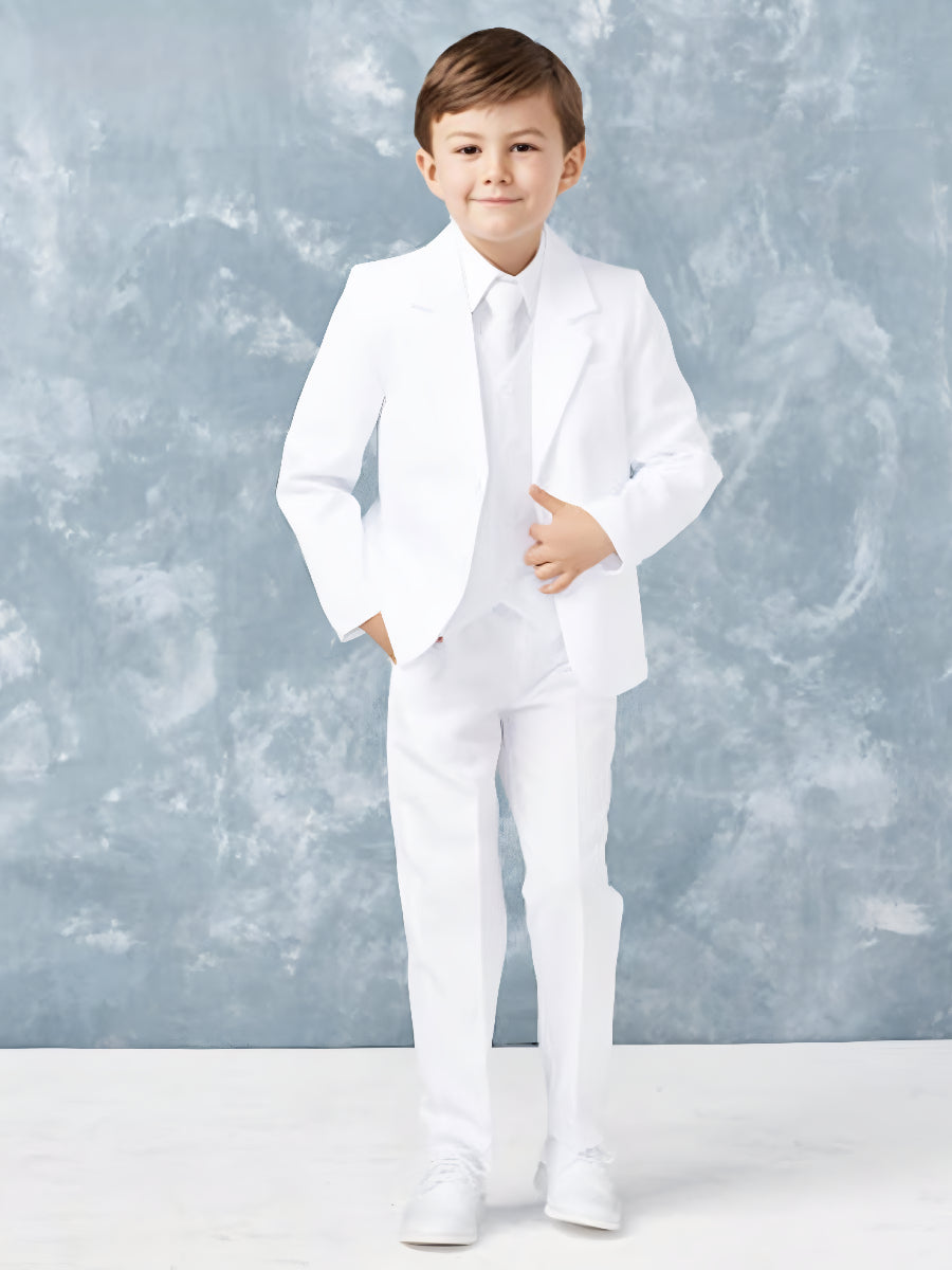 Elevate his formalwear with this impeccably tailored 5-piece boys' suit, designed for timeless elegance and versatility. Featuring a sharp navy blue jacket, vest, trousers, crisp white shirt, and matching tie, this set is perfect for weddings, communions, and special occasions. Made from premium fabric for comfort and durability, it ensures a dashing look all day long. Available in 7 colors and husky sizes (8-22) for the perfect fit.