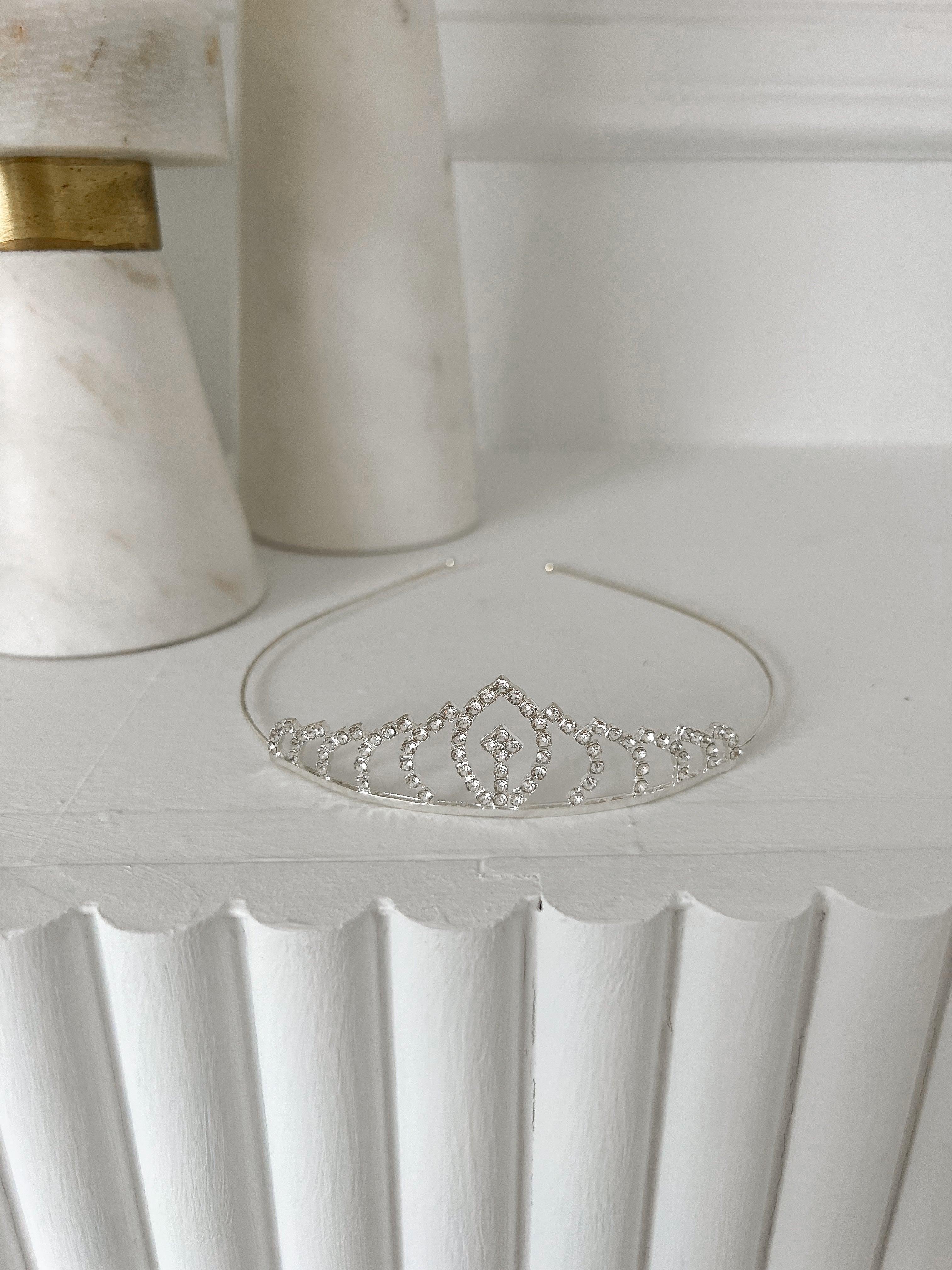 The Valentina Crystal Tiara Headband is a refined silver rhinestone accessory designed to add graceful sparkle to any special occasion look. Featuring a delicate tiara silhouette with brilliant crystal detailing, this headband delivers elegant shimmer while maintaining a lightweight, comfortable fit. Crafted with high-quality silver-toned rhinestones arranged in a classic crown-inspired pattern, this one-size headband sits securely and beautifully on little girls of all ages. Its slim, structured band ensures a polished finish without feeling bulky. Perfectly suited for first communion, christening ceremonies, flower girl dresses, pageants, birthdays, portraits, and formal celebrations, this crystal tiara headband pairs effortlessly with all of our girls’ special occasion gowns. Whether completing a communion look or adding sparkle to a party dress, this timeless rhinestone tiara creates a true princess moment. One size fits most girls.