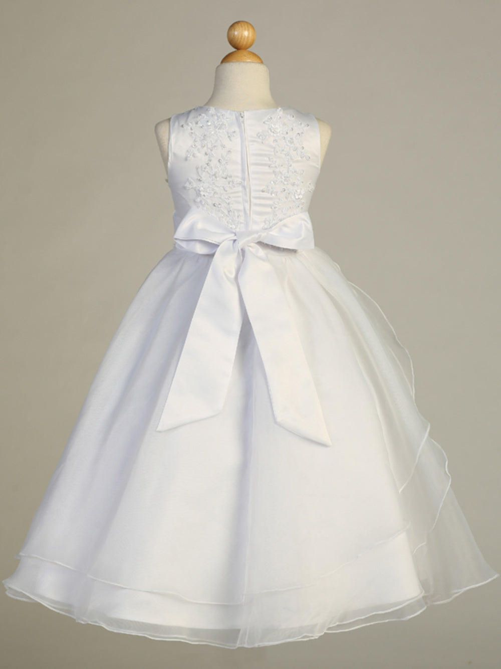 The Sophia dress is a vision of grace, perfect for communions, flower girl moments, and special occasions. Featuring a delicately embroidered bodice with subtle beadwork, this tea-length gown cascades into a dreamy layered organza skirt. A satin sash with a charming back bow adds the perfect finishing touch. Sizes are selling fast—secure yours now in time for your special day!