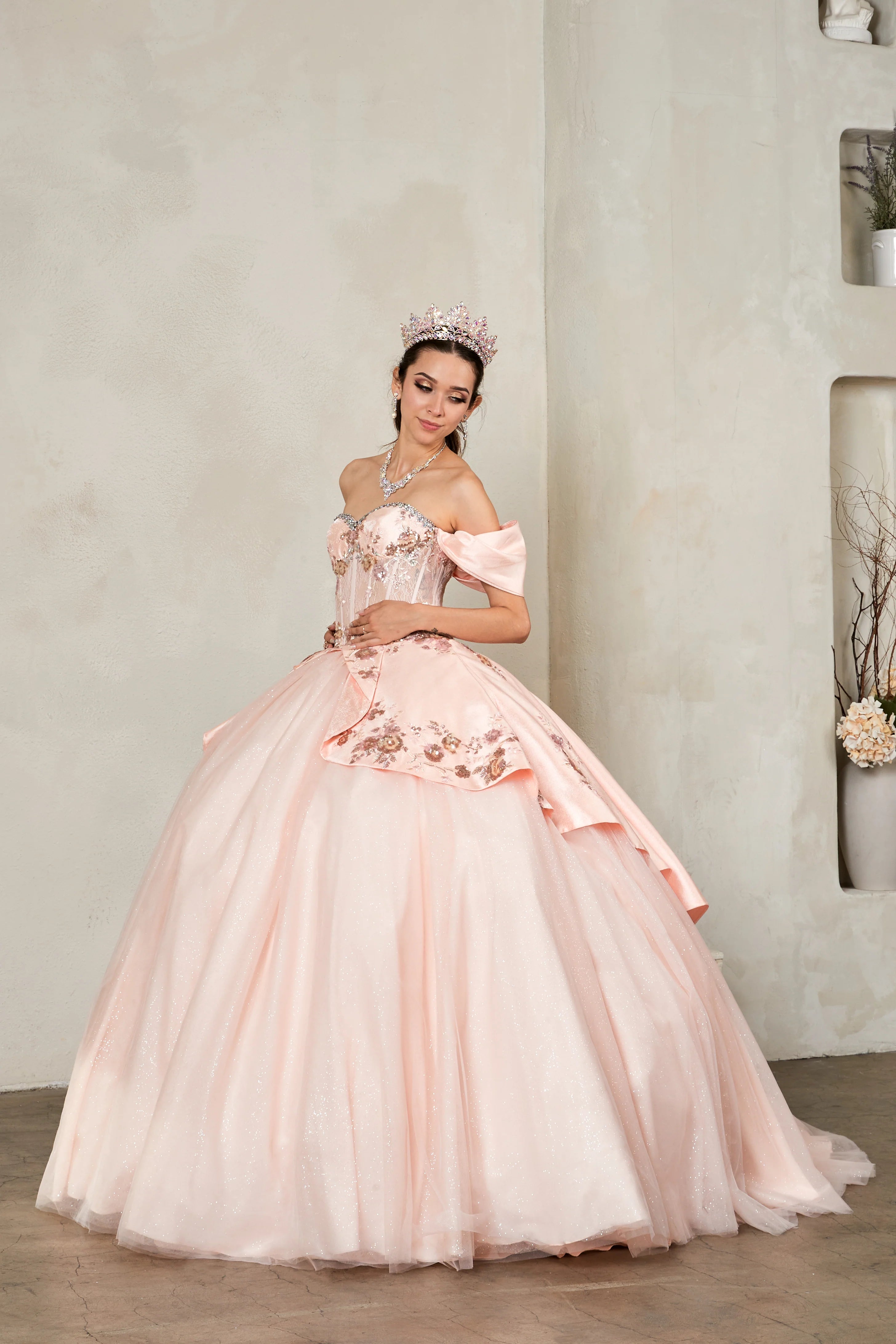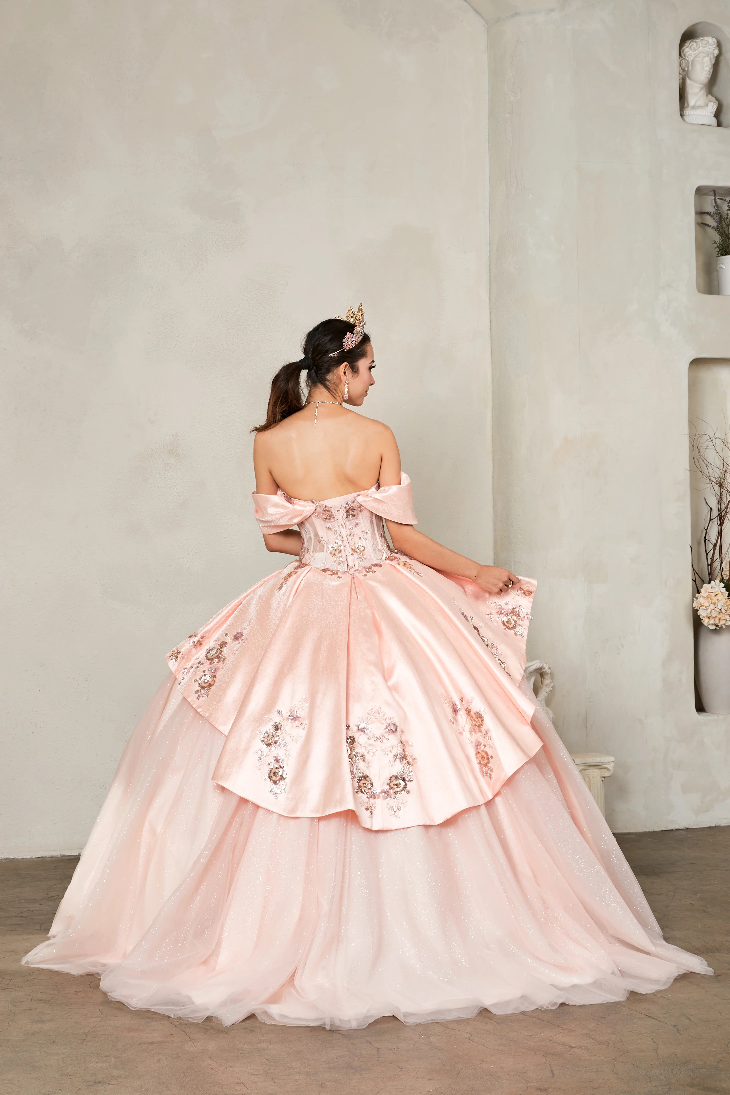 Sophisticated and regal, the Soraya Midnight Gown brings dramatic elegance to your most unforgettable celebration. Designed in a rich navy blue with dazzling glitter tulle, this off-the-shoulder quinceañera gown features a structured corset bodice with floral embroidery, cascading peplum layers, and statement satin sleeves. The ballgown skirt sparkles with every movement, creating a luminous effect perfect for quinceañeras, Sweet 16s, and evening pageants. With its bold color and exquisite craftsmanship, this gown commands attention from every angle.