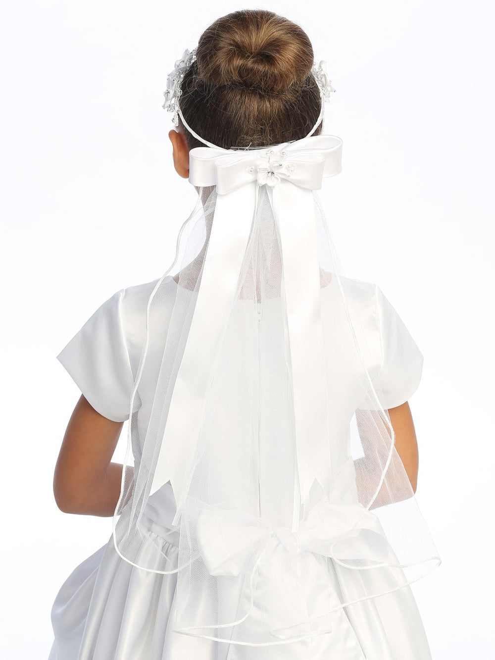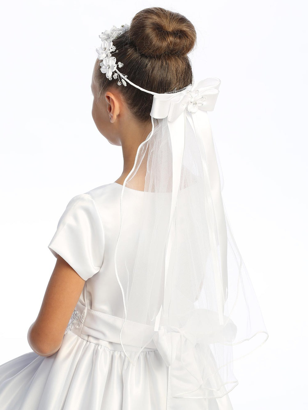 Make her First Communion day extra special with the Stephanie Kids Communion Veil. This delicate 18" single-layer veil features satin flowers and sparkling rhinestones, beautifully arranged on a comfortable headband. The elegant satin bow at the back adds a charming finishing touch, making this veil a perfect accessory for her memorable day. Designed for a secure fit and timeless style, this veil will complement any First Communion dress effortlessly.