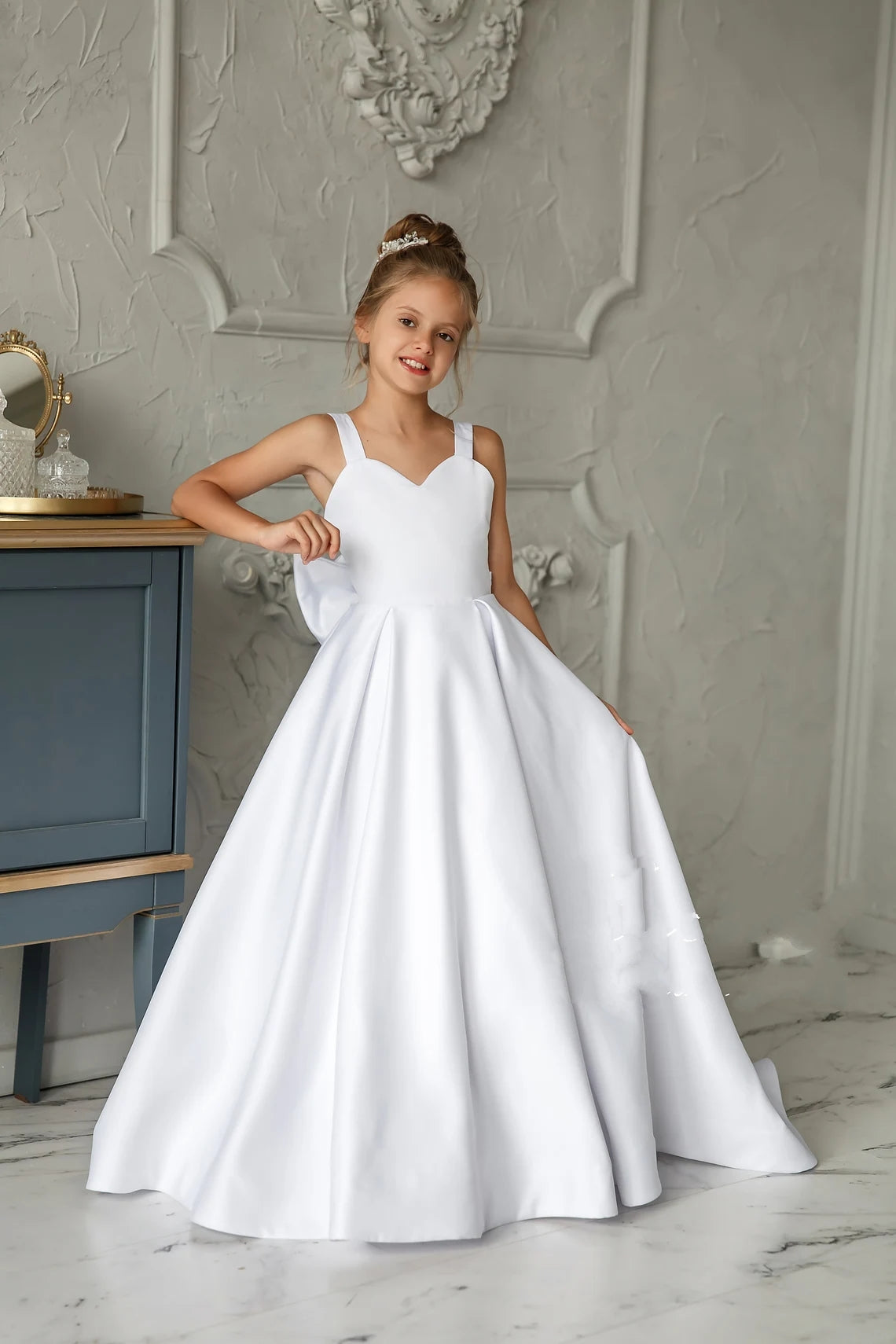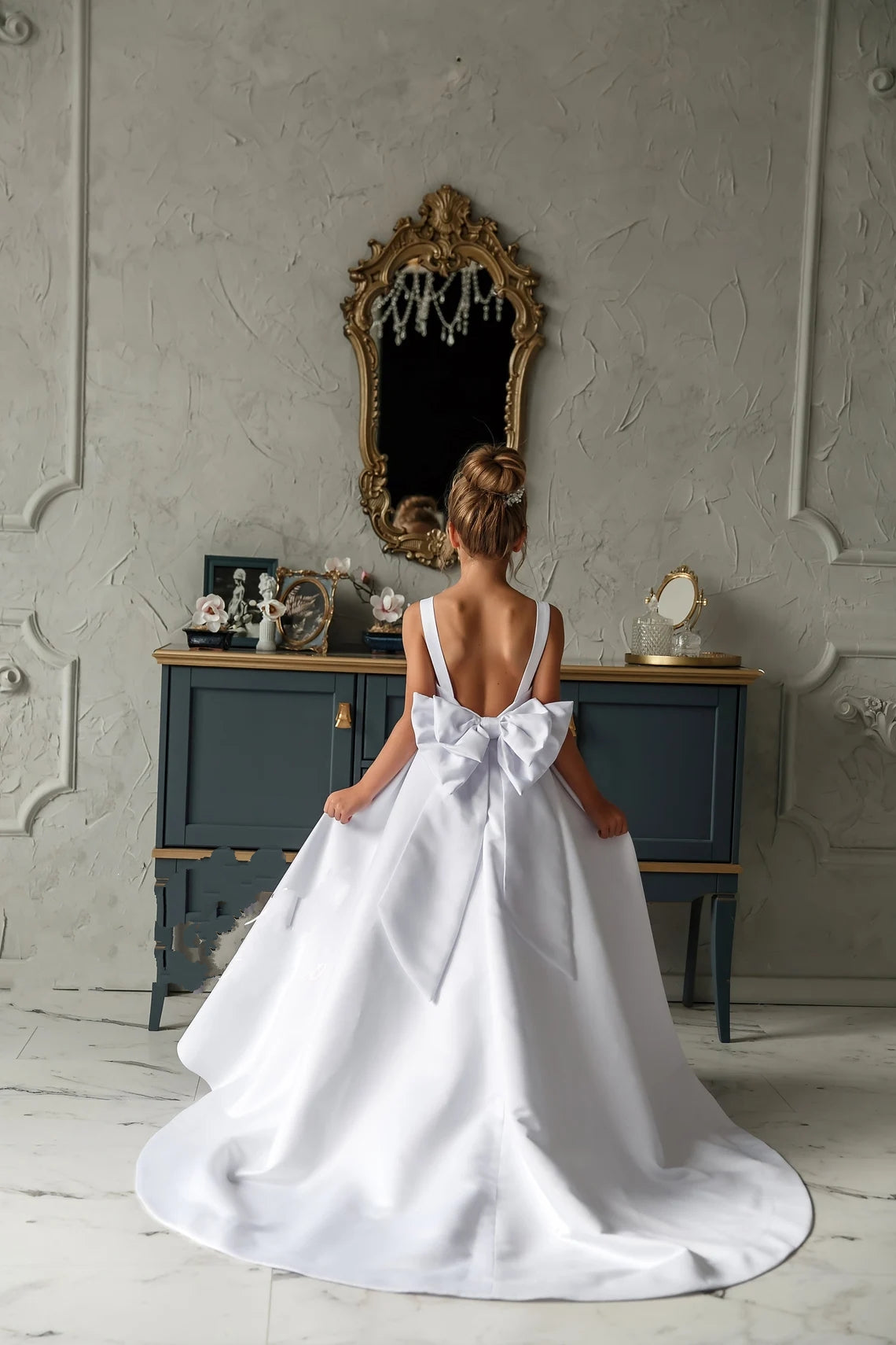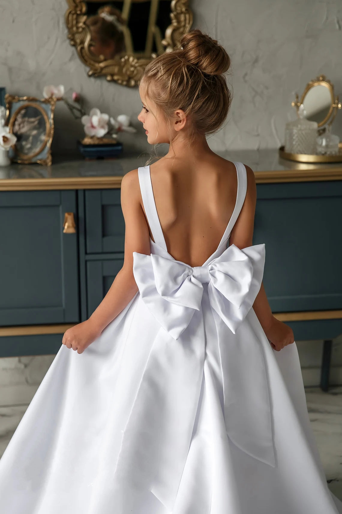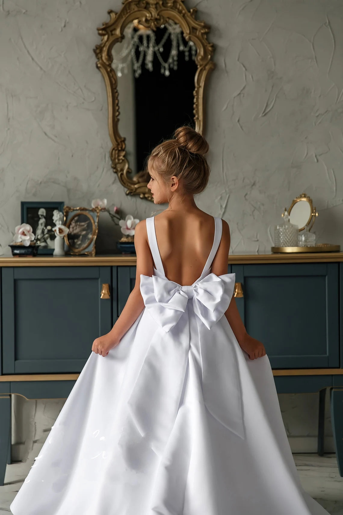 Designed with wide straps and a captivating sweetheart neckline, this dress also features a deep plunging V neckline in the back, adding an unexpected touch of sophistication. The oversized bow accent in the back complements the full A-line skirt with a train, making every entrance memorable. Perfect for weddings, galas, or any momentous event, this flower girl dress promises to make special occasions truly unforgettable.