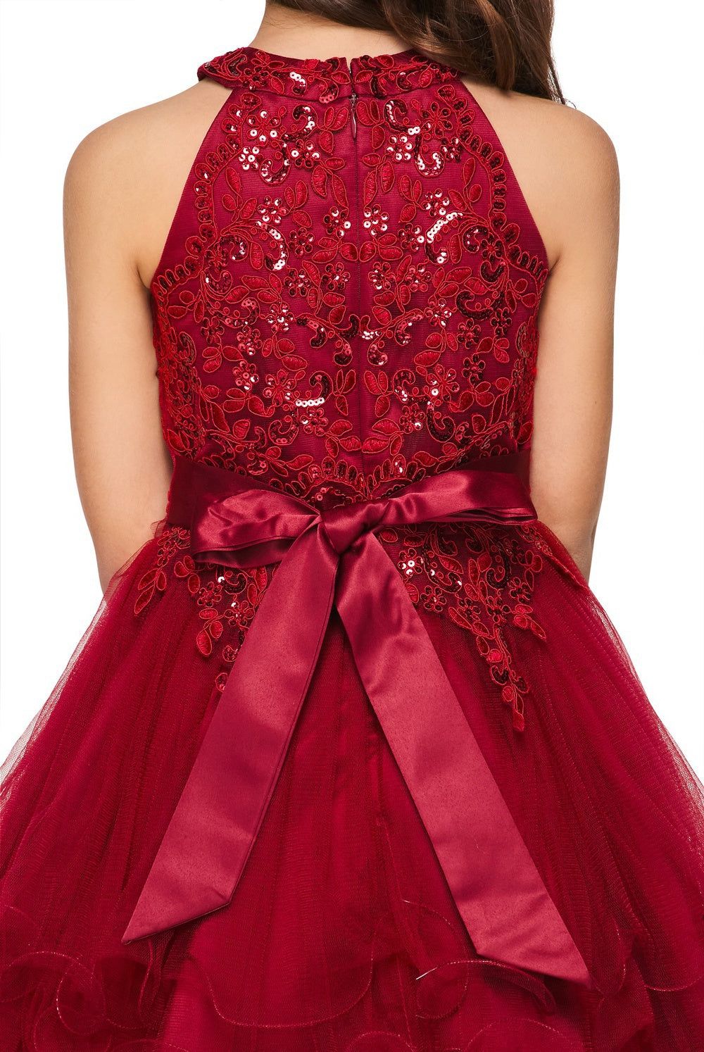Girls short Couture pageant dress is absolutely stunning. This dress showcases a beautiful halter neckline meticulously handcrafted with sequins and beads. The full short skirt is gorgeous in multiple layers of delicate tulle with corset tie that allows for easy adjustments without any necessary alterations.