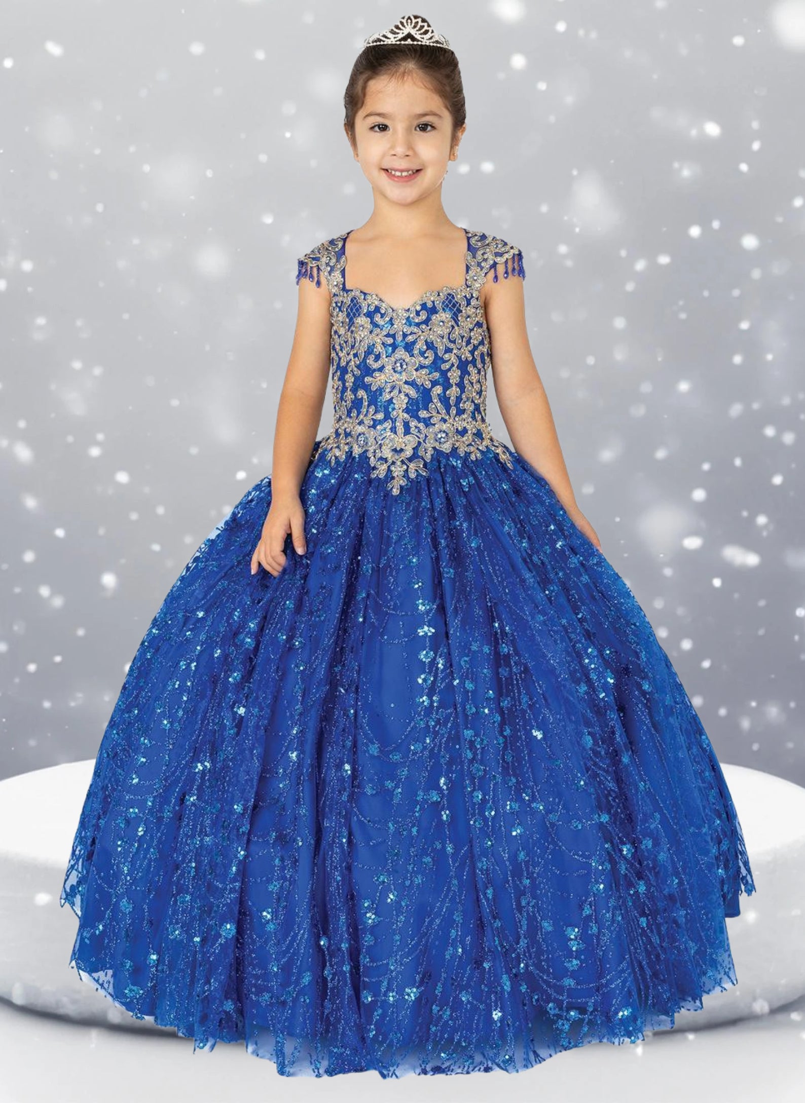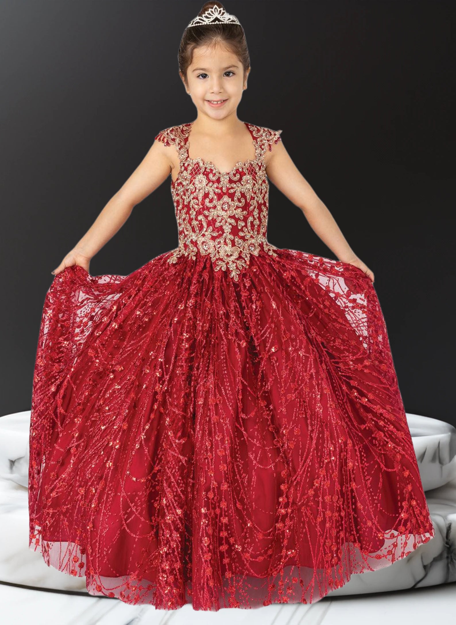The Stunning Misha Sequin Lace Embroidered Pageant Gown for girls is a true showstopper, featuring an embellished beaded lace bodice that exudes elegance and charm. With intricate beaded cap sleeves and a sweetheart neckline, this gown leads into a sequin voluminous skirt that flows gracefully to the floor length, ensuring a regal presence on stage. The keyhole back and corset tie in back add a touch of sophistication, completing this enchanting masterpiece..