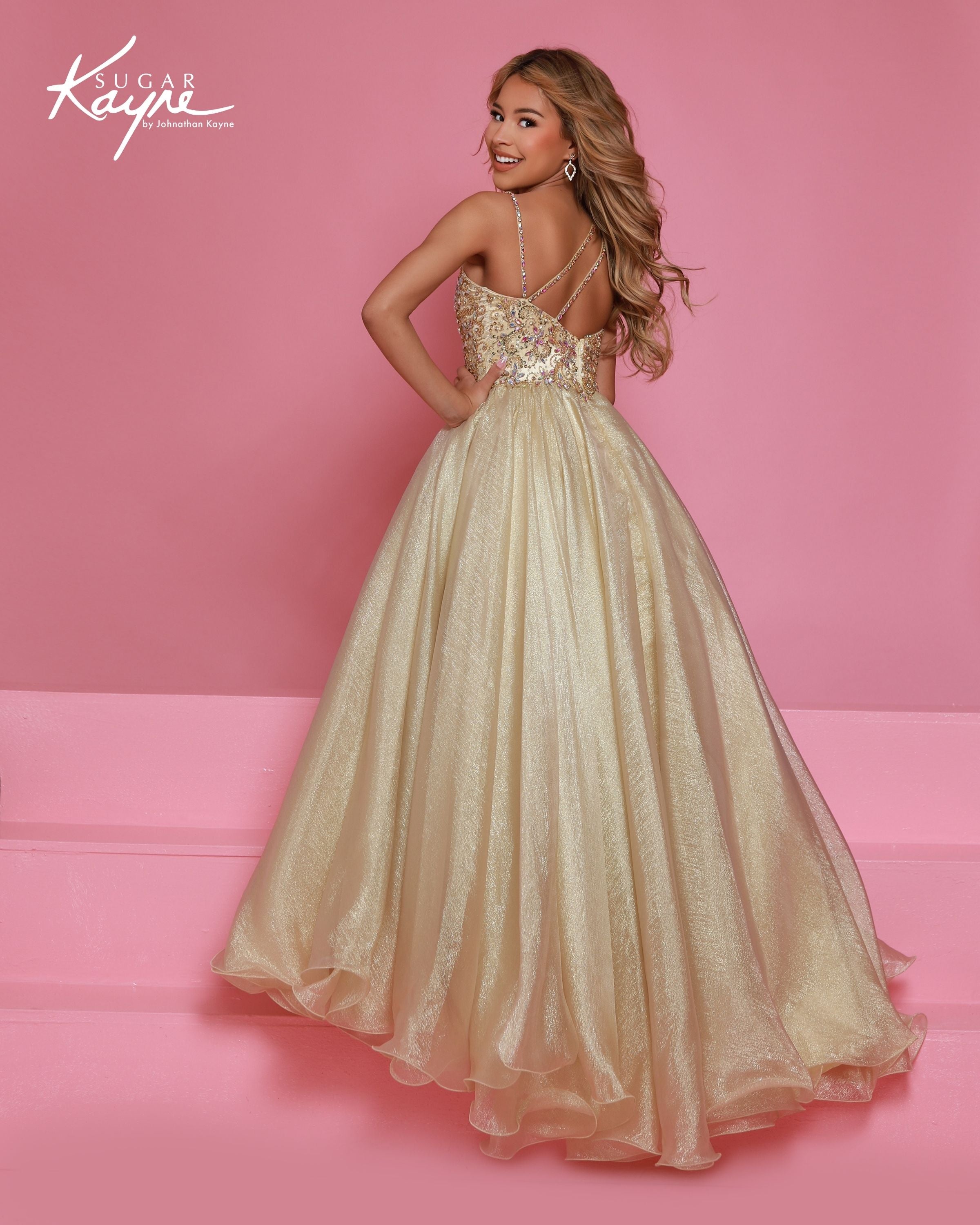 Elevate her pageant moment with this breathtaking Sugar Kayne couture ball gown, designed for the girl who deserves to shine at every event. The shimmering bodice dazzles with hand-placed crystal embellishments, offering maximum sparkle under stage lights, photographers’ flashes, and father-daughter dance spotlights. A sweeping full skirt crafted from premium metallic organza floats effortlessly with every turn, giving her the show-stopping silhouette judges adore. Available in two radiant shades, this gown blends luxury, comfort, and unforgettable stage presence. Ideal for high-level pageants, birthdays, portraits, and elegant special occasions, it delivers the flawless Sugar Kayne glamour parents trust and little queens love.