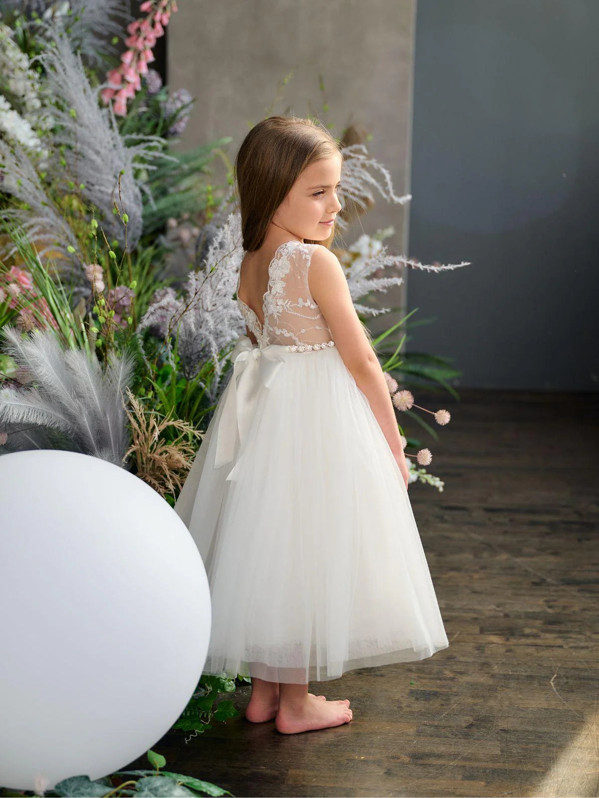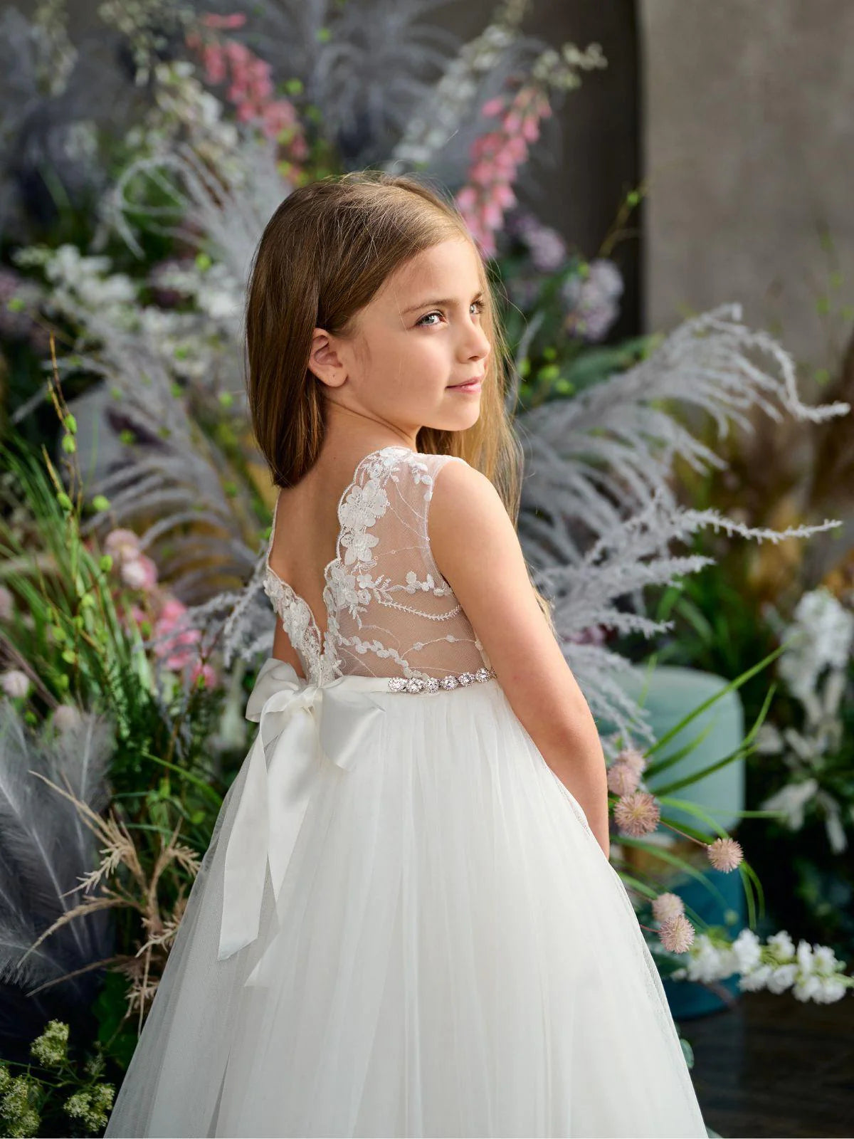 Introducing the Teter Warm Couture Chloe Flower Girl Dress, a stunning piece that will make any little girl feel like a princess on her special day. This exquisite dress features a three-dimensional floral design with a sheer V-back that adds a touch of elegance and sophistication. The off-white round neckline and sleeveless design create a classic and timeless look, while the back zip closure ensures a secure and comfortable fit. The 3D lace bodice of the Chloe Flower Girl Dress is intricately detailed and adds a delicate touch to the overall design.