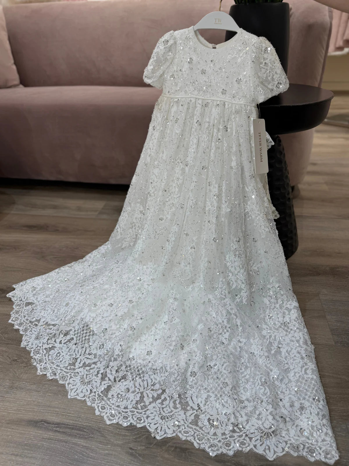 The Elionette Pearl Gown by Teter Warm Couture is a stunning heirloom christening gown created for life’s most meaningful celebrations. Designed with an intricate lace overlay and embroidered floral detailing, this luxury baptism gown features a soft shimmer from delicately sewn sequins that catch the light beautifully. Sweet puff sleeves add a traditional silhouette, while the full-length flowing skirt is finished with a scalloped lace hem for graceful movement and timeless elegance. Crafted with a soft inner lining for all-day comfort, this couture baby christening gown ensures your little one feels as beautiful as she looks. The pearl button back closure completes the refined design, making it ideal for christenings, baptisms, dedication ceremonies, and formal baby portraits. A true keepsake gown for families seeking an elegant and luxurious baptism dress. Available in baby sizes 3M–18M.