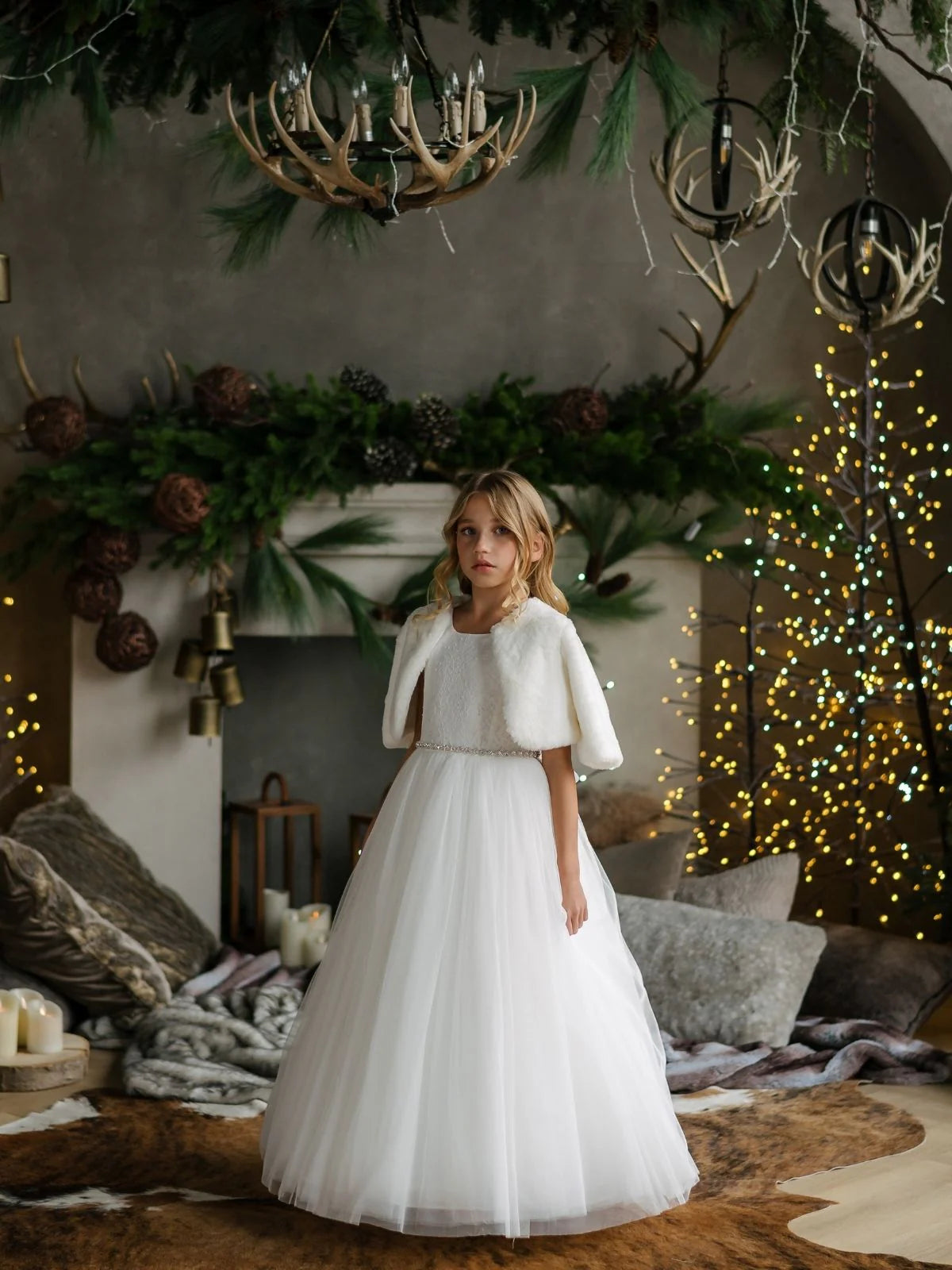 Elevate her winter special occasion look with the Dakota Faux Fur Jacket from Teter Warm Couture. This luxurious cropped jacket is crafted in ultra-soft ivory faux fur, finished with a sparkling rhinestone clasp and satin lining for added comfort. Perfect over flower girl gowns, communion dresses, or any formal event, the Dakota jacket provides warmth without compromising style. Designed to complement Teter Warm couture dresses seamlessly, it's an elegant layering piece for any season.