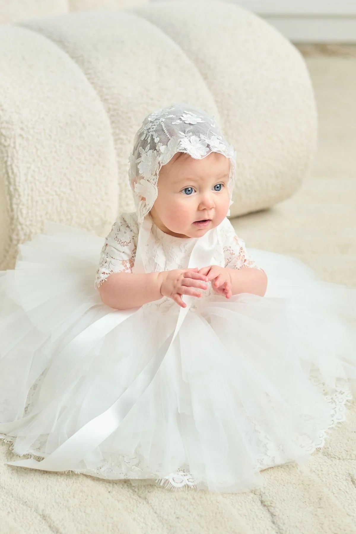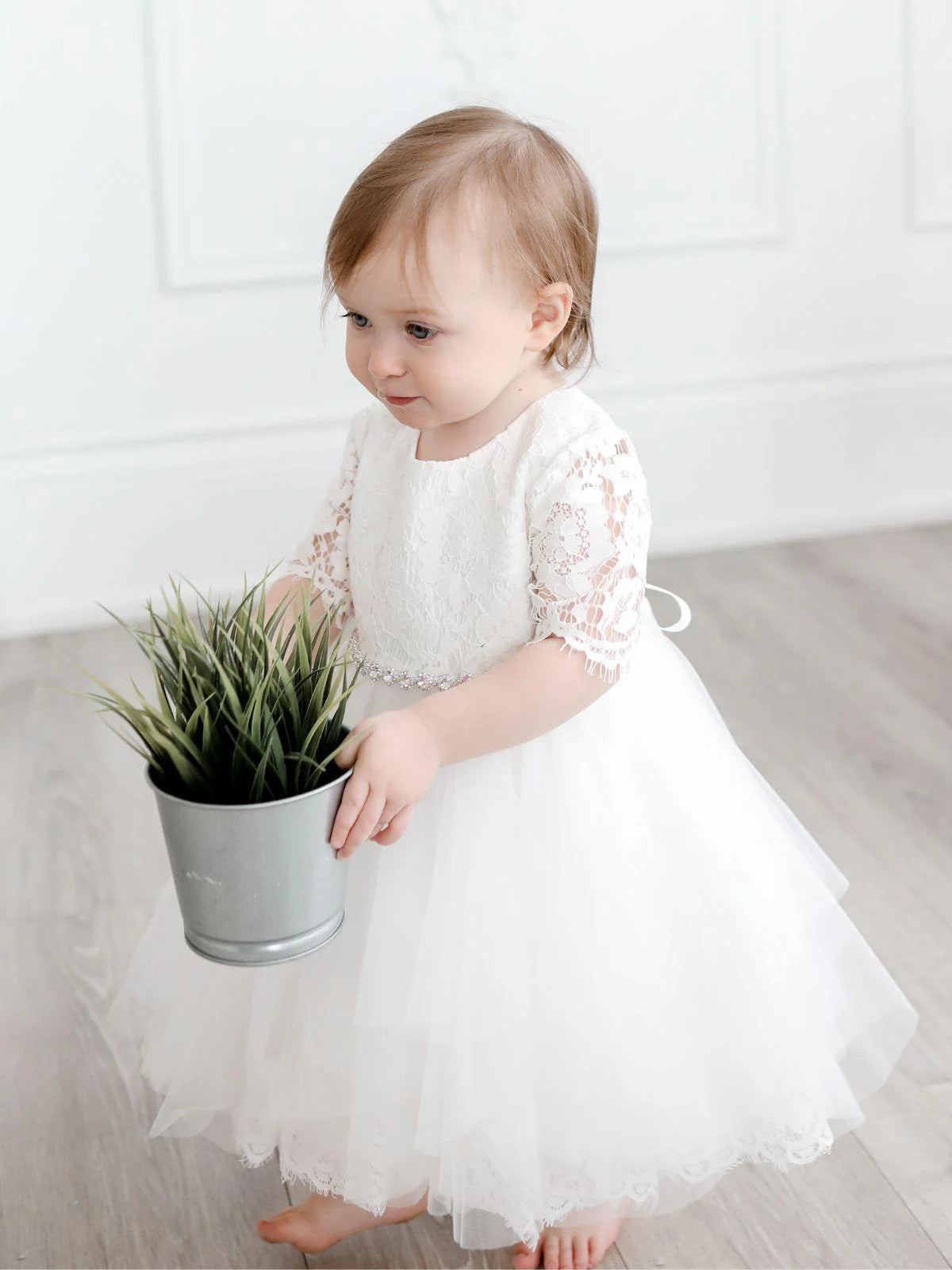 The dress boasts a lace bodice that is both intricate and refined, creating a harmonious blend of texture and design. Completing the look is a lace tulle skirt that adds a gentle volume and a fairy-tale quality to the dress, ensuring the little one looks angelic on their special day.